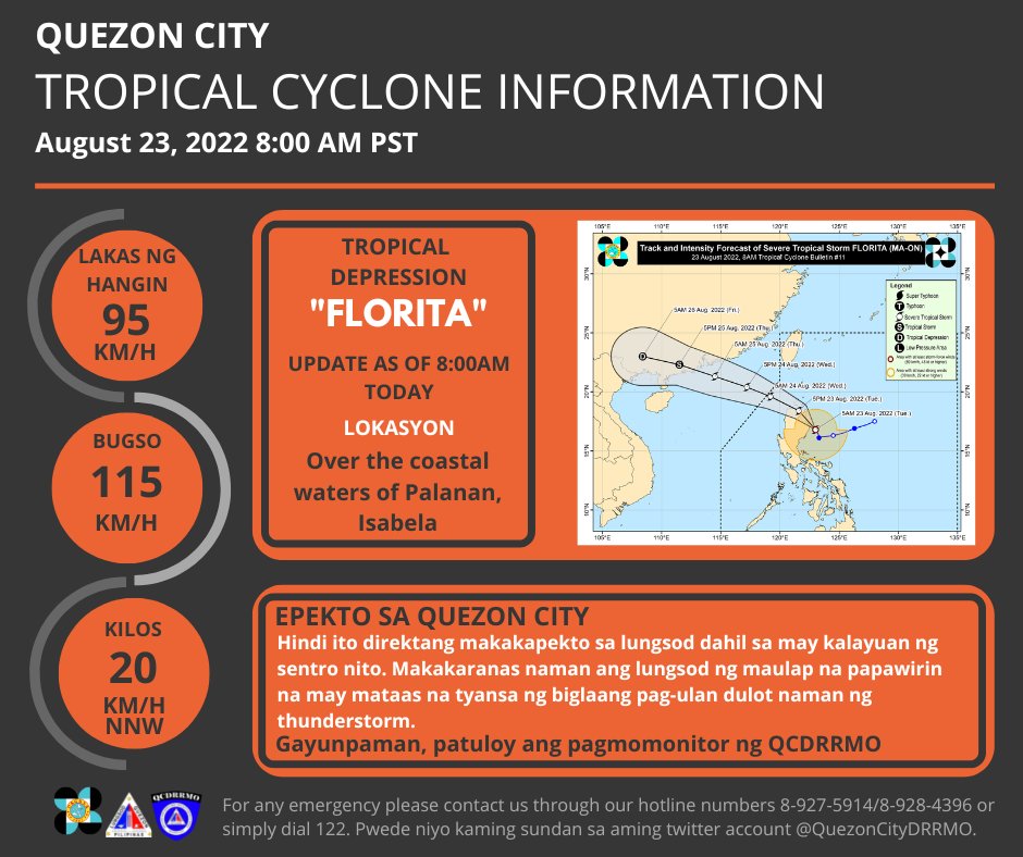 Dahil sa may kalayuan ang sentro ng BAGYONG FLORITA, hindi ito makakaapekto sa lungsod, ngunit patuloy na makakaranas ang lungsod ng maulan na panahon dulot ng localized thunderstorms at malakas na Hanging Habagat.