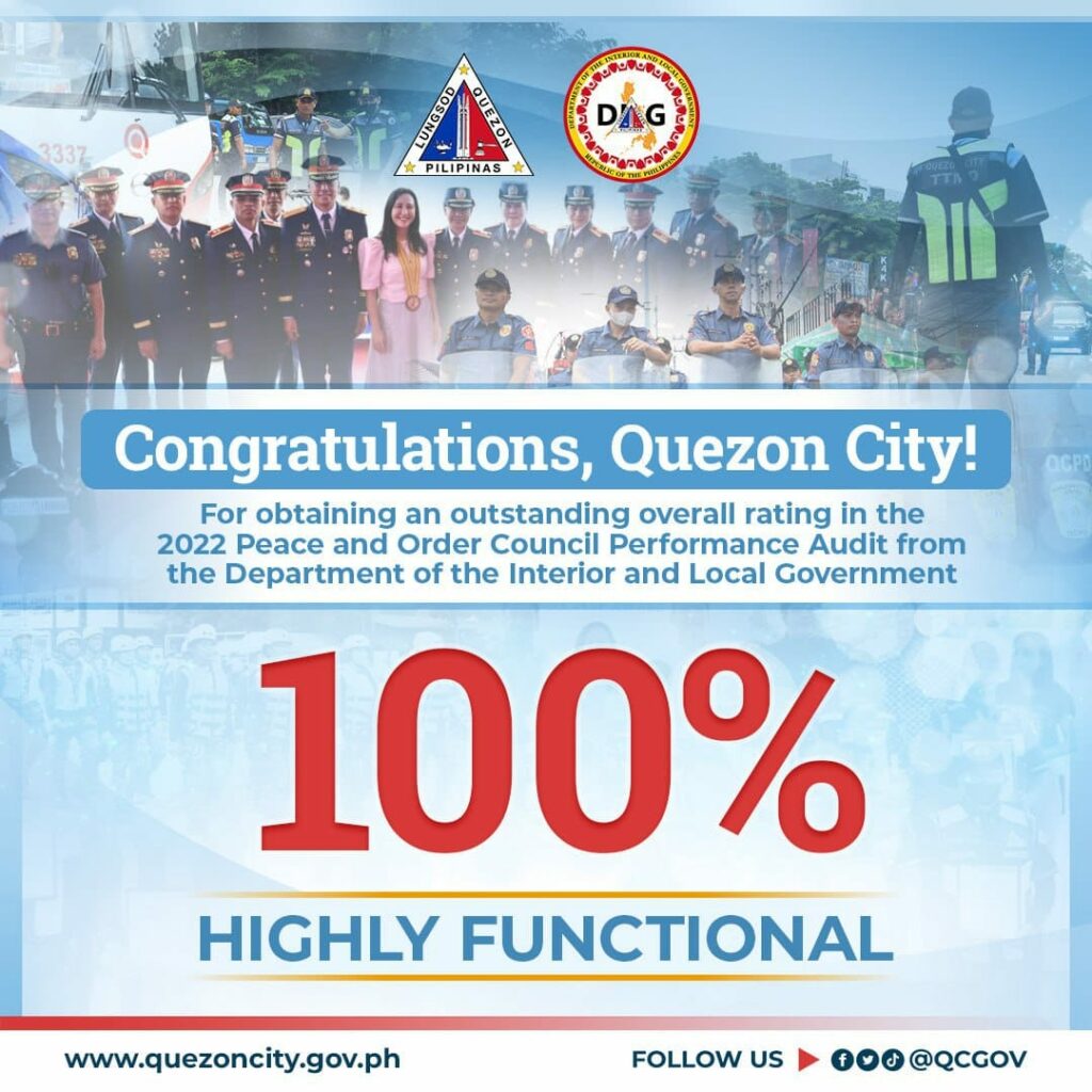 Muling kinilala ang Quezon City matapos makakuha ng 100% performance rating o katumbas ng adjective rating na Highly Functional para sa taong 2022 mula sa Peace and Order Council (POC) Performance Audit ng Department of the Interior and Local Government (DILG).