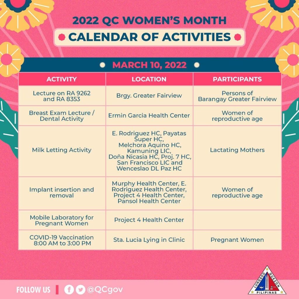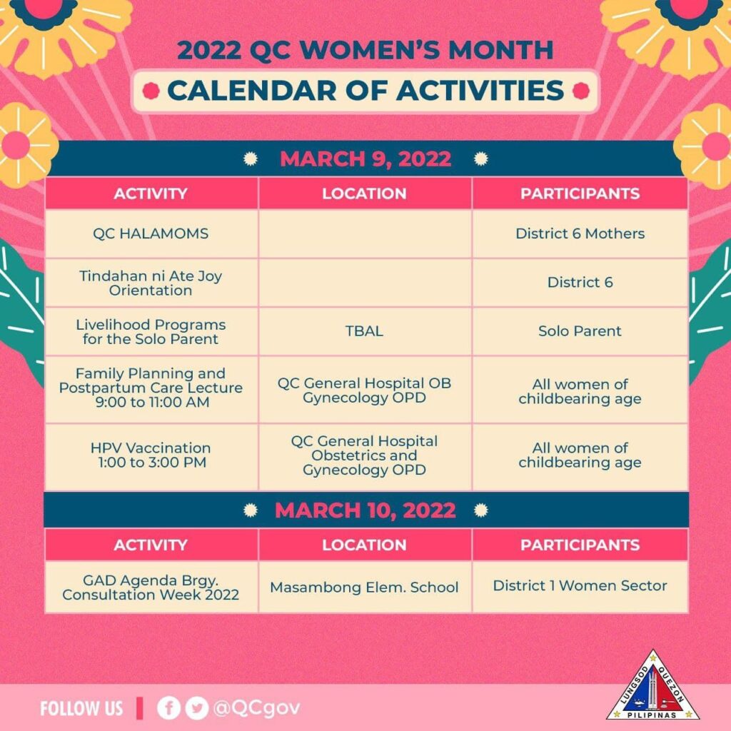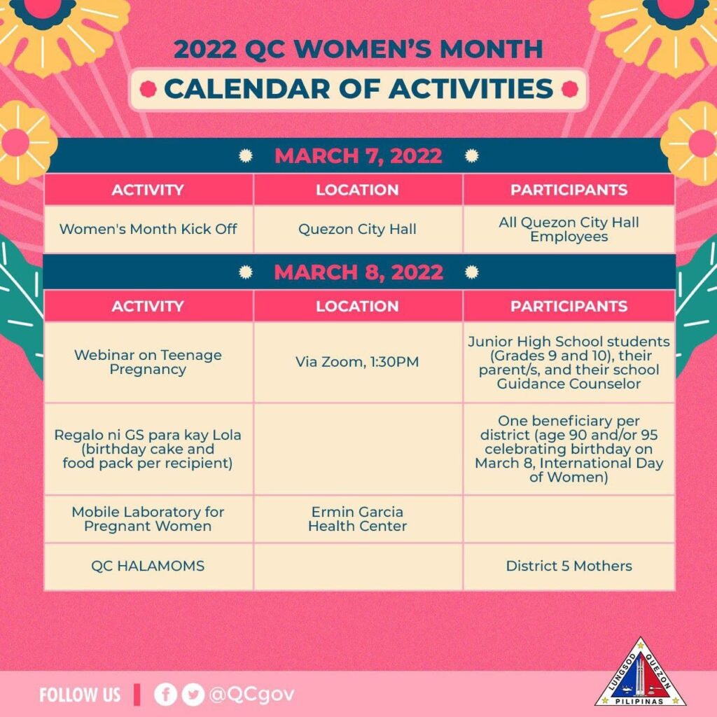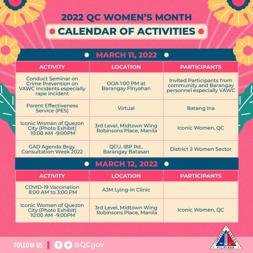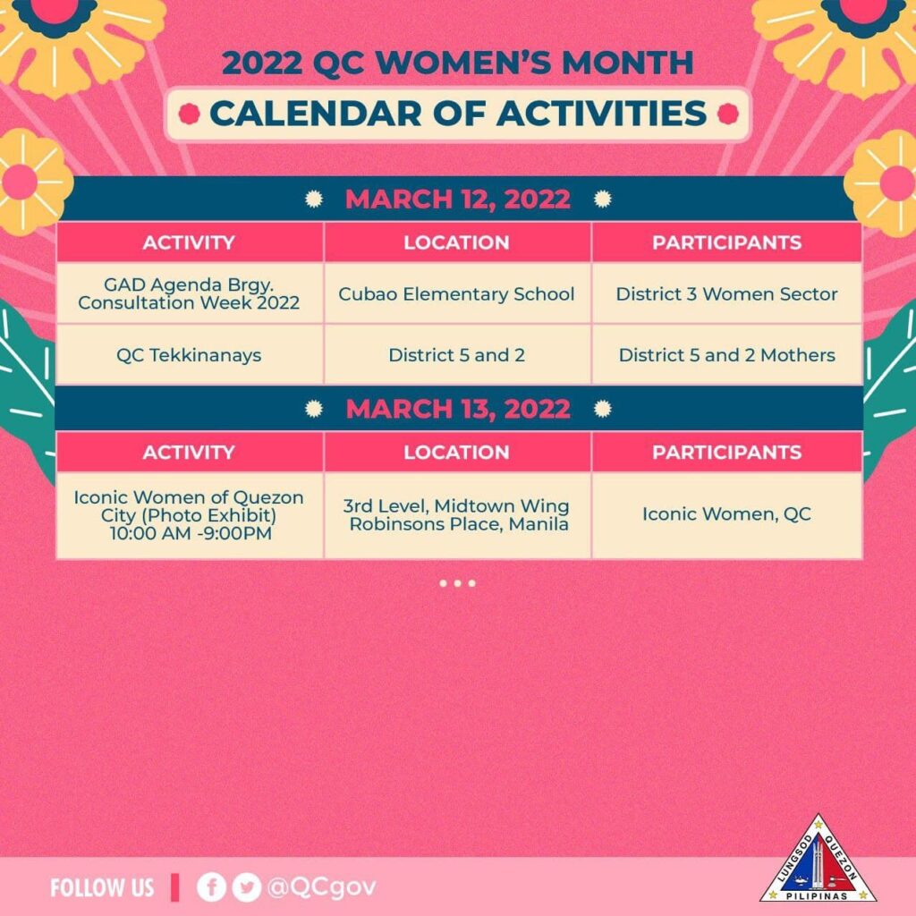 Tingnan ang kabuuan ng calendar of activities dito: https://qcwebsite.sparksoft-demo.com/calendar-of-events/celebration-of-womens-month/