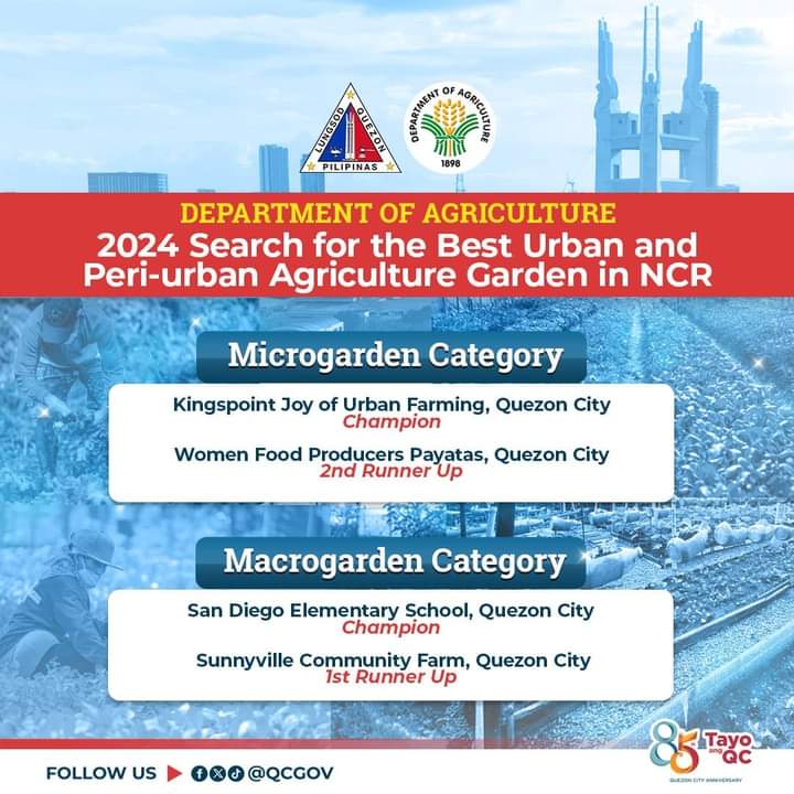 Nagwagi ang ilang urban farms at paaralan sa ating lungsod sa ginanap na 2024 Search for the Best Urban and Peri-urban Agriculture Garden in NCR ng Department of Agriculture.