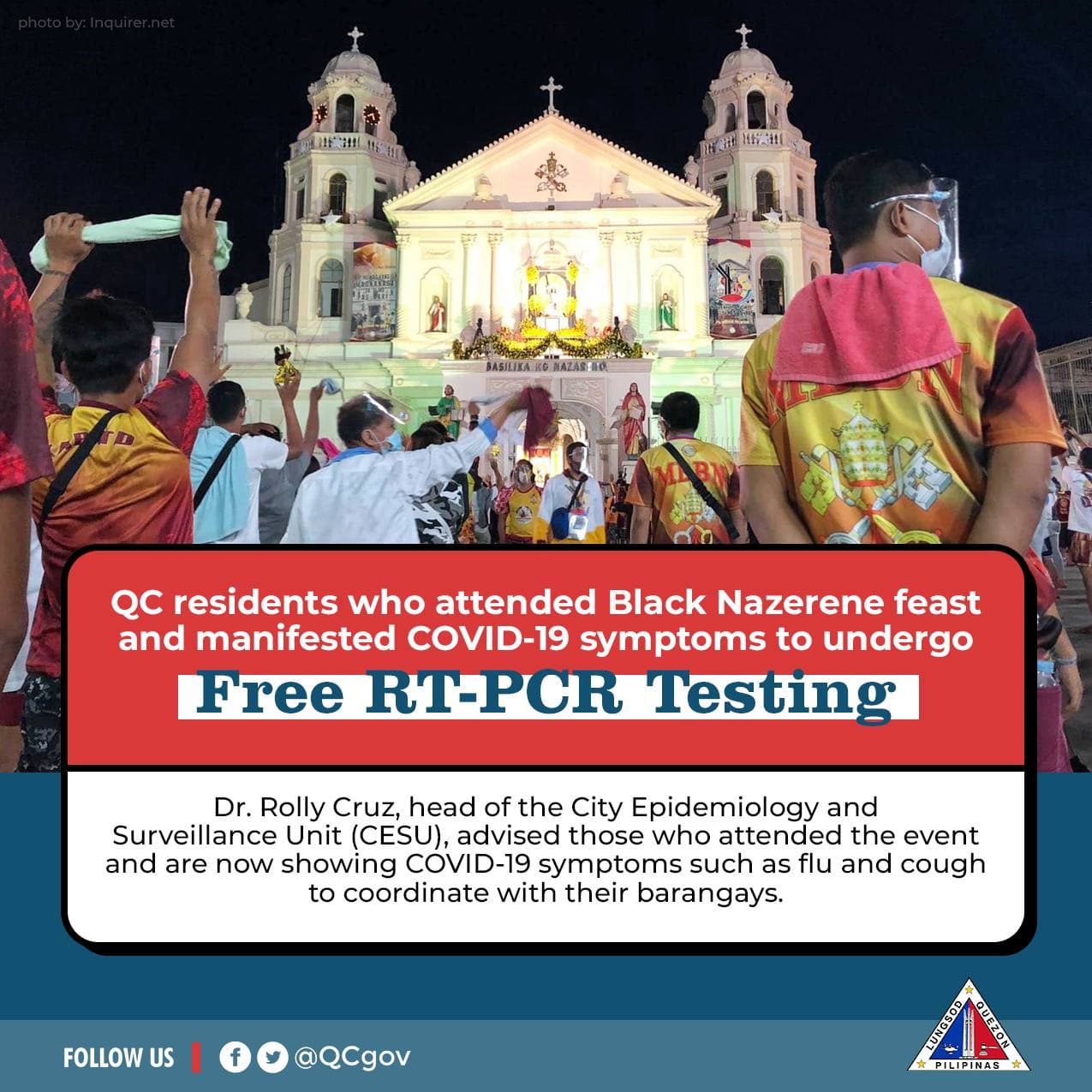 Para sa QCitizens na dumalo sa #Traslacion2021 at nakararanas ng sintomas ng COVID-19, makipag-ugnayan sa inyong barangay para sa libreng RT-PCR test sa ating testing centers sa lungsod.