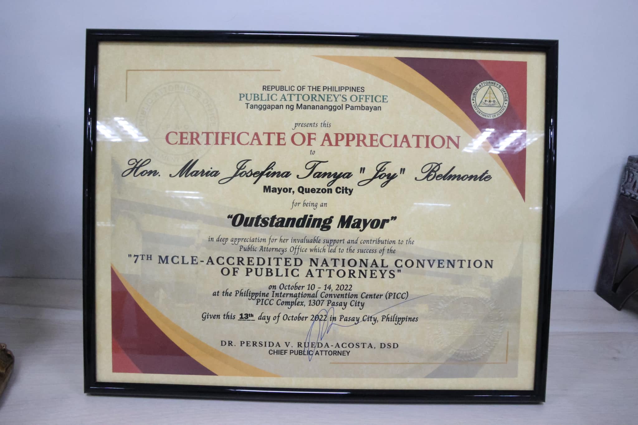 Ginawaran ng pagkilala si Mayor Joy Belmonte bilang Outstanding Mayor sa ginanap na 7th Mandatory Continuing Legal Education (MCLE) Accredited National Convention of Public Attorneys nitong nakaraang linggo.