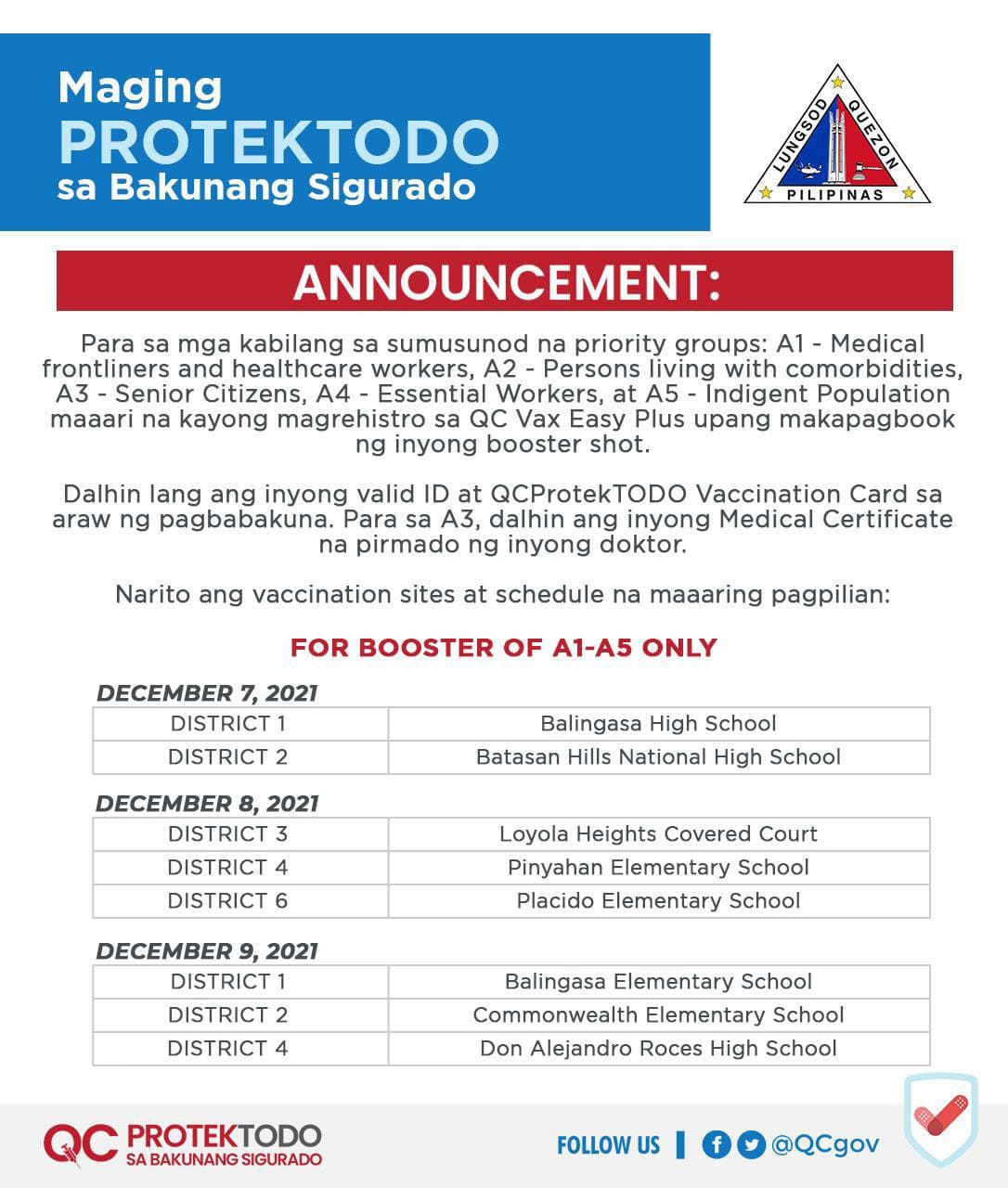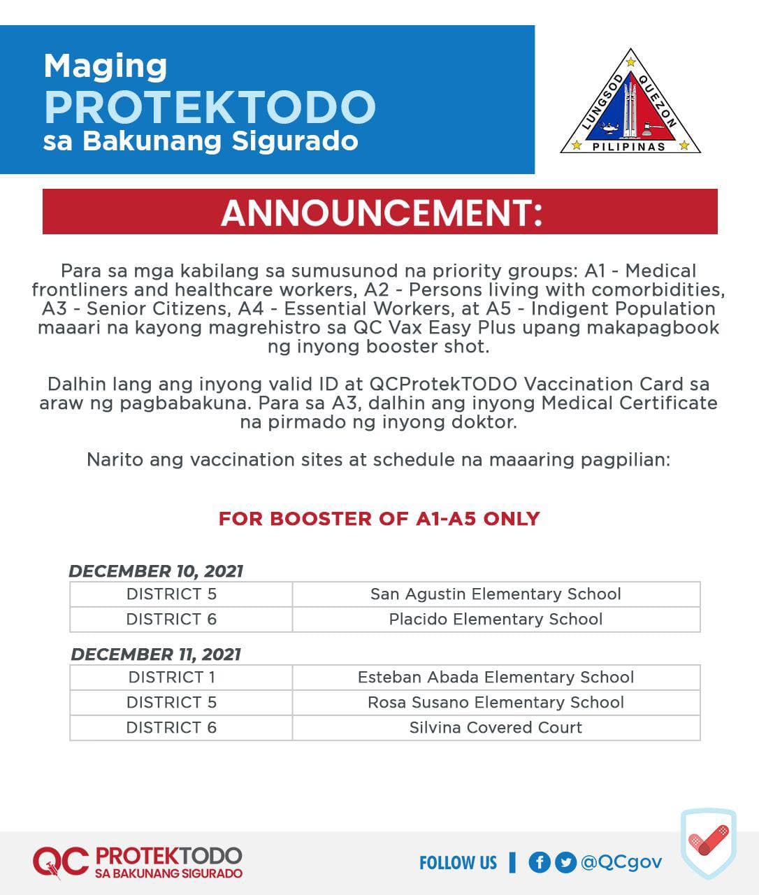 Magrehistro lang sa QC Vax Easy Plus (https://qceservices.quezoncity.gov.ph/qcvaxeasy) at pumili sa vaccination sites at schedule. Para sa magpapabakuna ng booster, dalhin lang ang valid ID at #QCProtekTODO Vaccination Card.