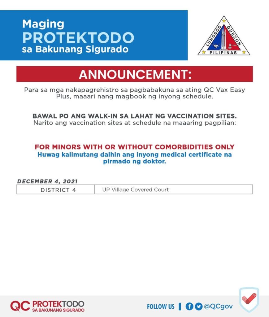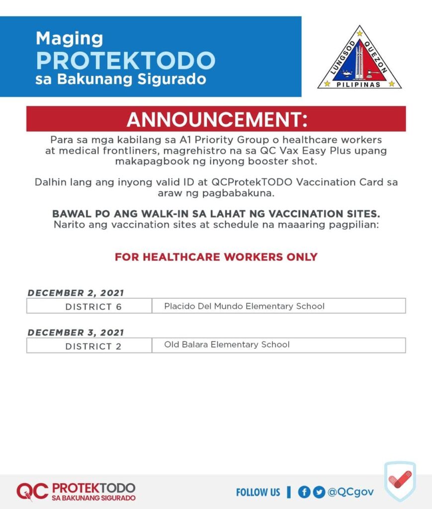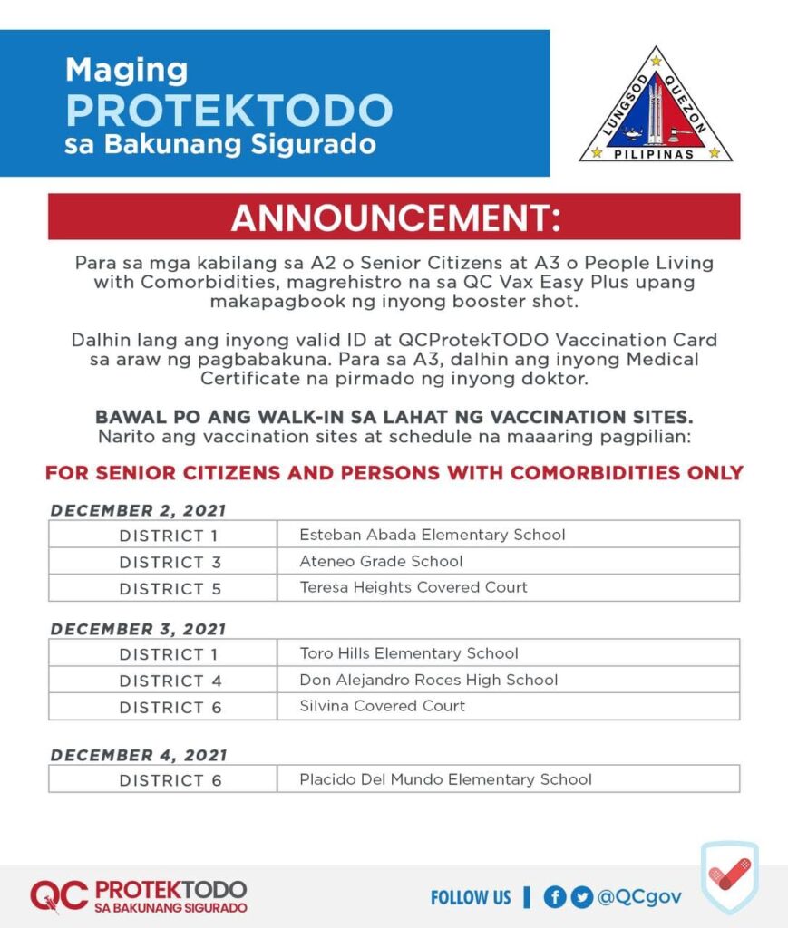Para sa magpapabakuna ng booster, dalhin lang ang valid ID at #QCProtekTODO Vaccination Card. Para sa A3 o People Living with Comorbidites, dalhin ang MEDICAL CERTIFICATE na pirmado ng inyong doktor sa araw ng pagbabakuna.