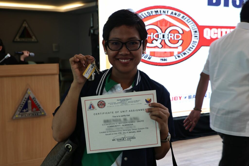 Mismong si Mayor Joy Belmonte ang nag-abot ng certificate at susi ng mga benepisyaryo, kasama sina District 6 Action Officer Atty. Mark Aldave, at Housing Community Development And Resettlement Department head Mr. Ramon Asprer.