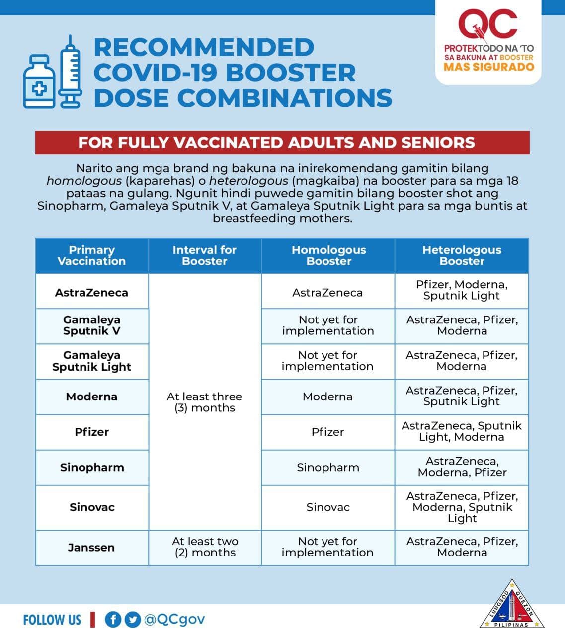 Narito ang mga brand ng bakuna na inirekomendang gamitin bilang homologous (kaparehas) o heterologous (magkaiba) na booster para sa mga 18 pataas na gulang. Ngunit hindi puwede gamitin bilang booster shot ang Sinopharm, Gamaleya Sputnik V, at Gamaleya Sputnik Light para sa mga buntis at breastfeeding mothers.