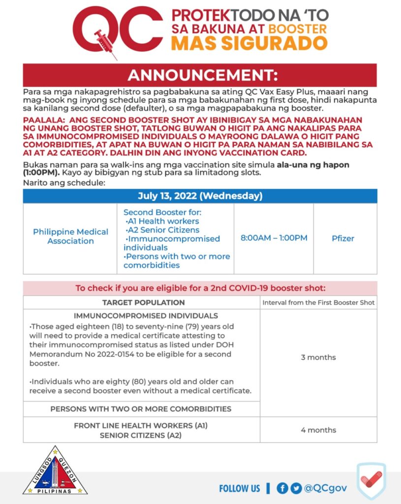 ANG SECOND BOOSTER SHOT AY IBINIBIGAY SA MGA NABAKUNAHAN NG UNANG BOOSTER SHOT, TATLONG BUWAN O HIGIT PA ANG NAKALIPAS PARA SA IMMUNOCOMPROMISED INDIVIDUALS O MAYROONG DALAWA O HIGIT PANG COMORBIDITIES, AT APAT NA BUWAN O HIGIT PA PARA NAMAN SA NABIBILANG SA A1 AT A2 CATEGORY.