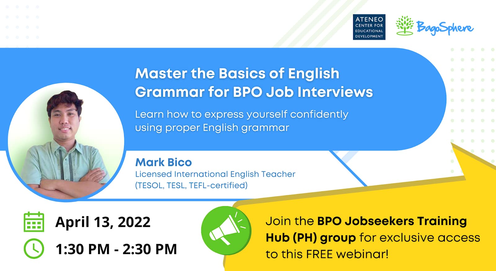 Enhance your communication skills with ‘Master the Basics of English Grammar for BPO Job Interviews’ webinar by BagoSphere and Ateneo Center for Educational Development (ACED).
