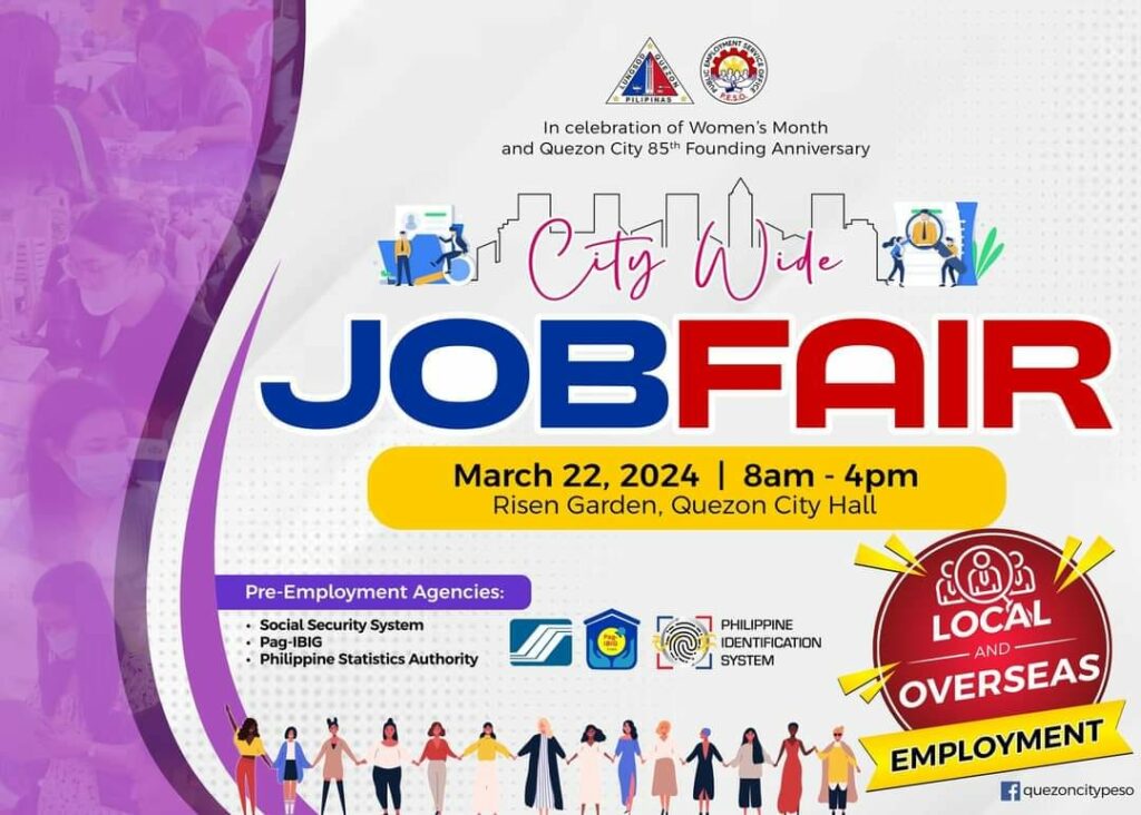 Magkakaroon ng Citywide Job Fair for local and overseas employment ang lokal na pamahalaan, bilang bahagi ng pagdiriwang ng 85th founding anniversary ng Quezon City at National Women’s Month.