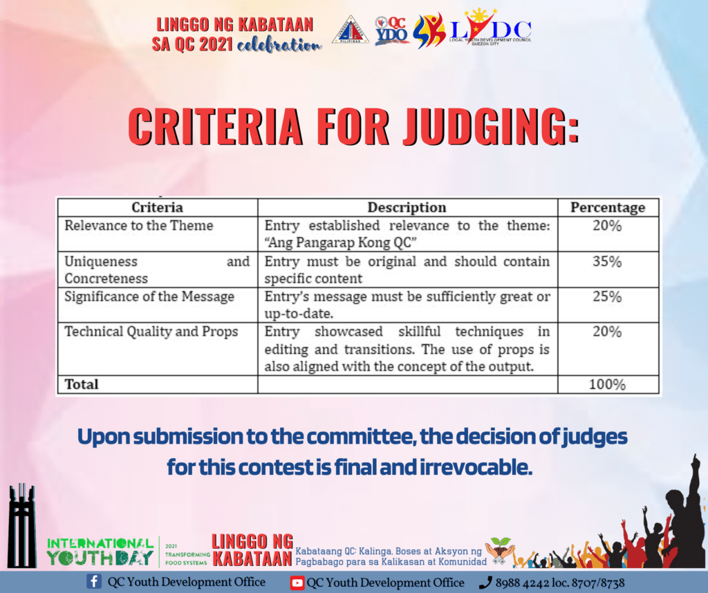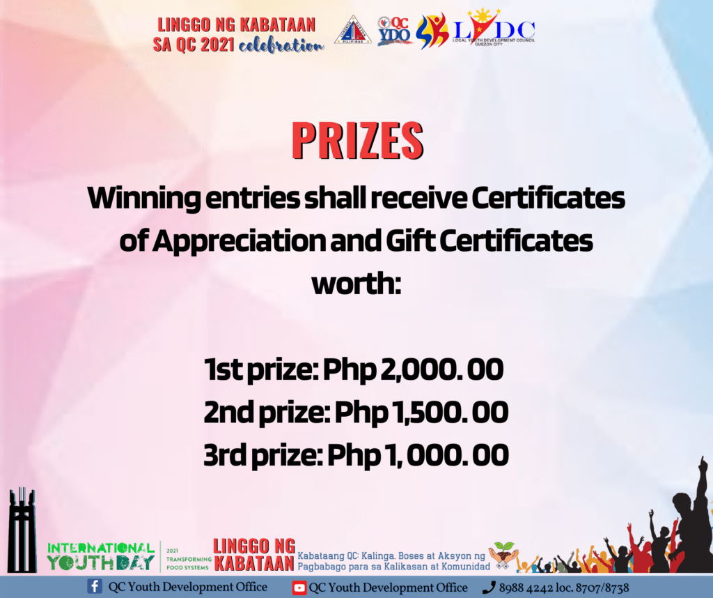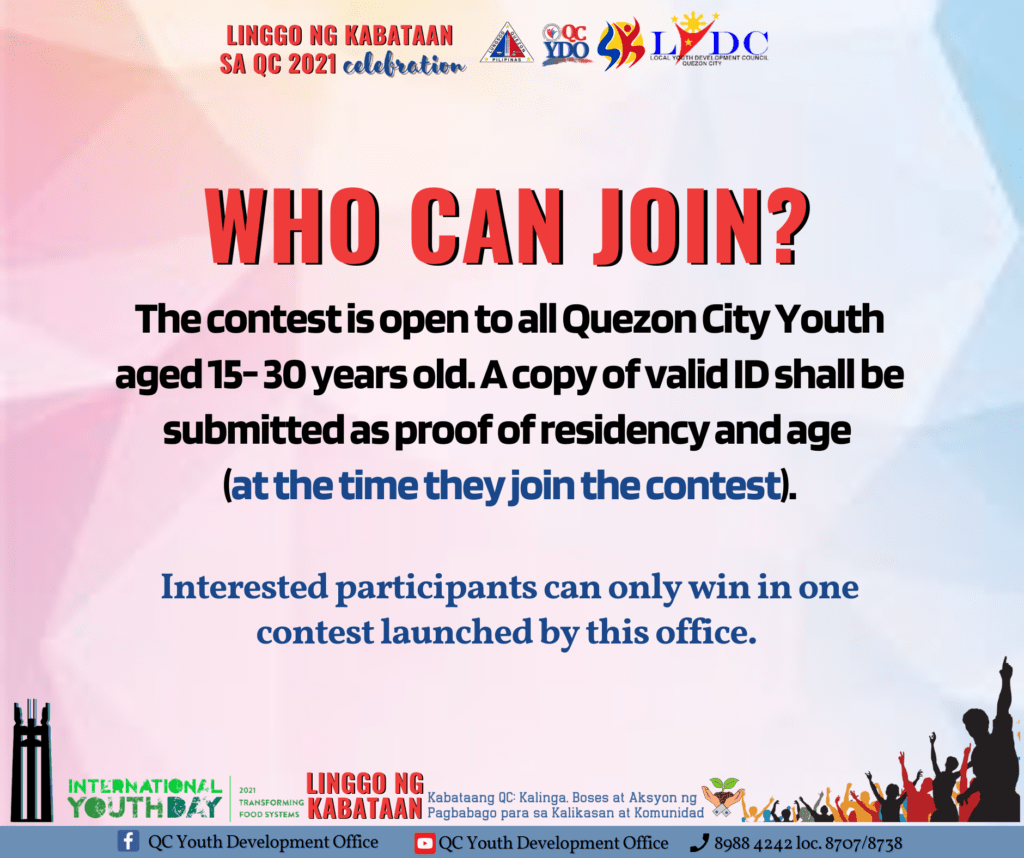 Basahin ang mechanics kung paano sumali. Malay mo, isa ka mga mananalo ng premyo! #PangarapNgKabataan #TransformativeQCYouth2021 #LinggoNgKabataanSaQC2021 #KabataangQCKasamaKaSaPagUnlad #SpreadJoyLoveAndUnityInQC