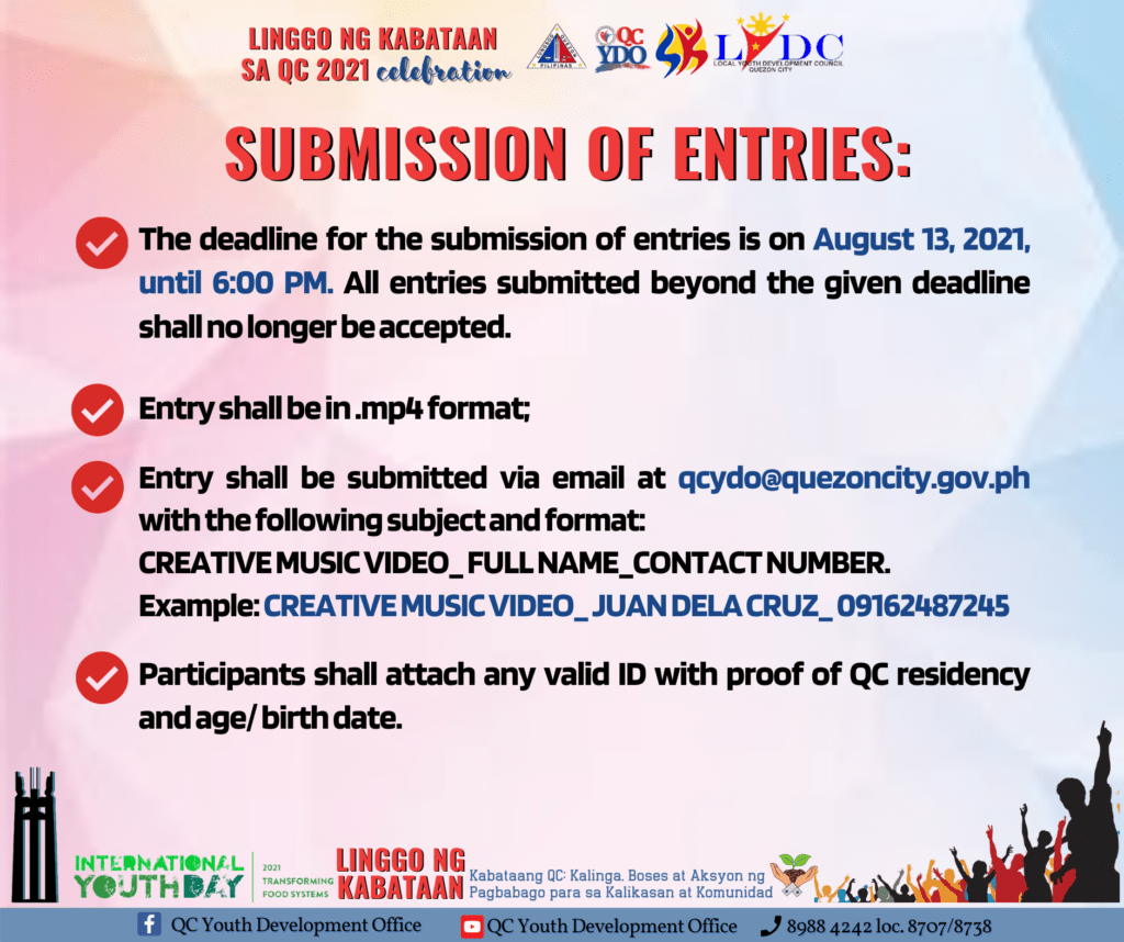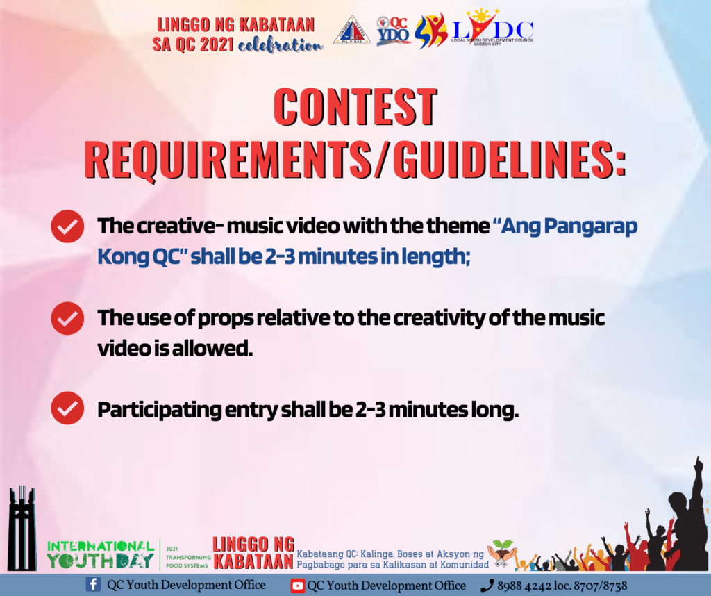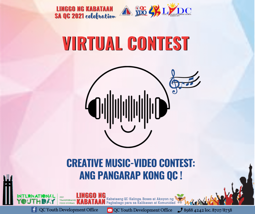 Makibahagi sa ating Linggo ng Kabataan sa QC 2021: Creative Music- Video Virtual Contest: Ang pangarap kong QC!Ang online contest na ito ay may layong hikayatin ang Kabataang QC na magbahagi ng kanilang pangarap para sa kapwa Kabataan at Komunidad!Bilang Kabataan, mahalaga ang pakikisa sa usaping youth development and empowerment.Kabataan, ano ang pangarap mong QC?