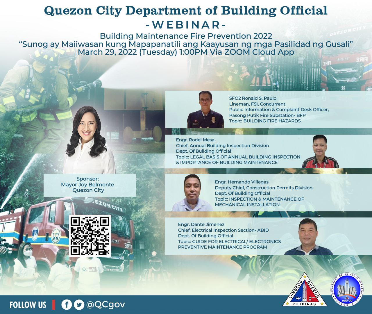 Bilang bahagi ng pagdaraos ng Fire Prevention Month isang WEBINAR ang isasagawa ng Office of the Quezon City Mayor sa pamamagitan ng Office of the BuildingOfficial – Quezon City at sa pakikipagtulungan sa Bureau of Fire Protection tungkol sa Building Maintenance Fire Prevention na pinamagatang “SUNOG AY MAIIWASAN KUNG MAPAPANATILI ANG KAAYUSAN NG MGA PASILIDAD NG GUSALI”