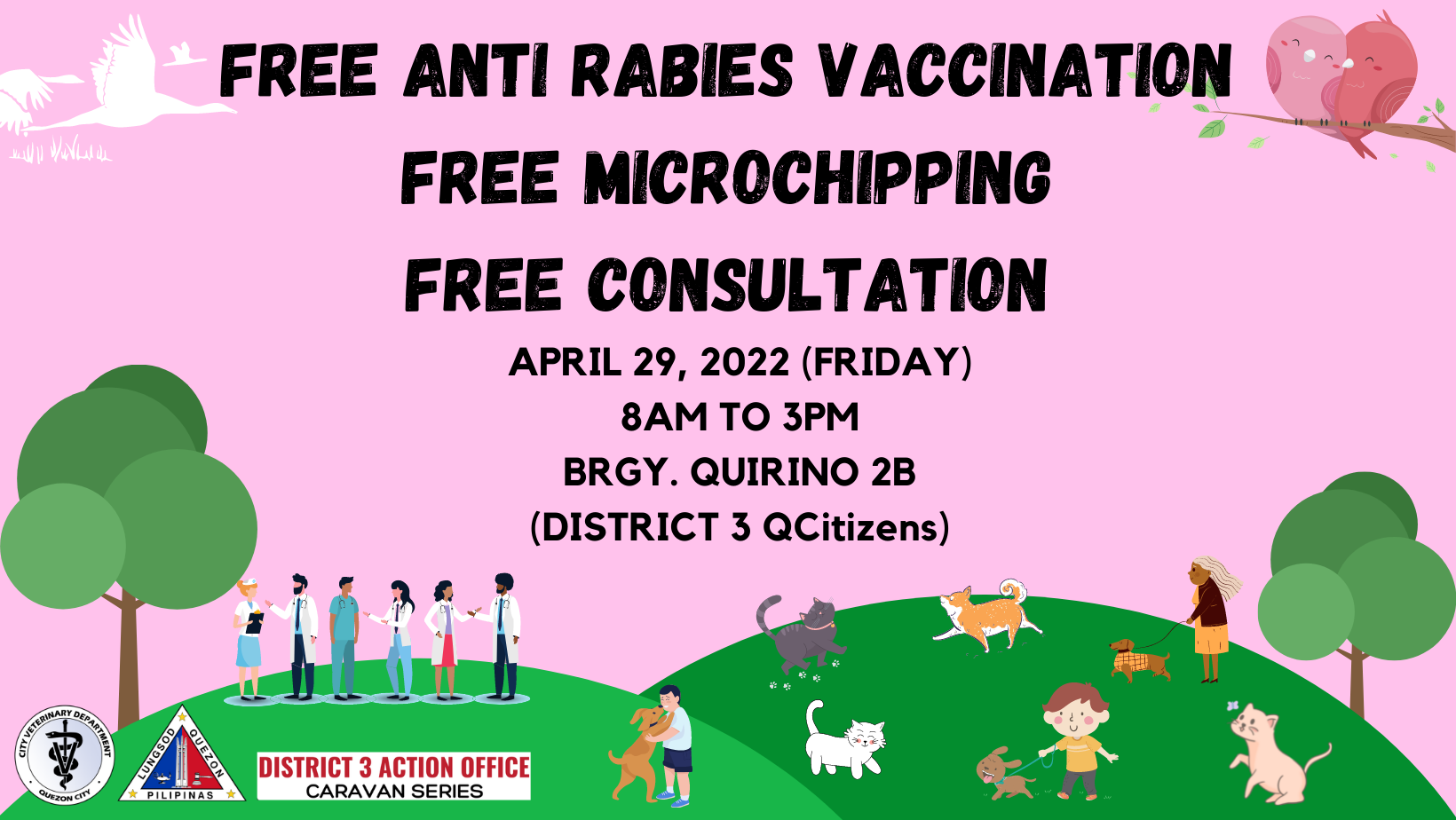 Magsasagawa ang QCVet ng libreng Anti Rabies Vaccination, Microchipping at Consultation sa darating na April 29, 2022 sa Barangay Quirino 2B mula 8:00 AM hanggang 3:00 PM.