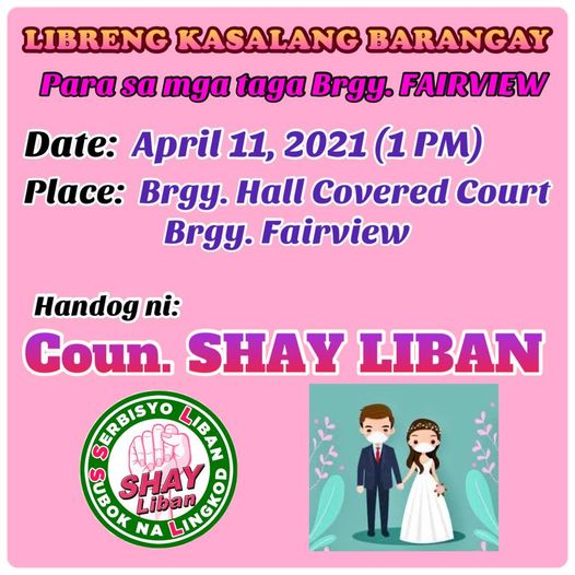Paunawa lang po, kailangan po nating sumunod sa mga rules ng ating gobyerno at dahil po dito, lilimitahan lang po ang pwedeng mag register sa libreng kasalan at lilimitahan din po ang mga bisita na pwedeng pumunta. Gagawin po natin ito “Per Barangay, Per Kasalan Only”.