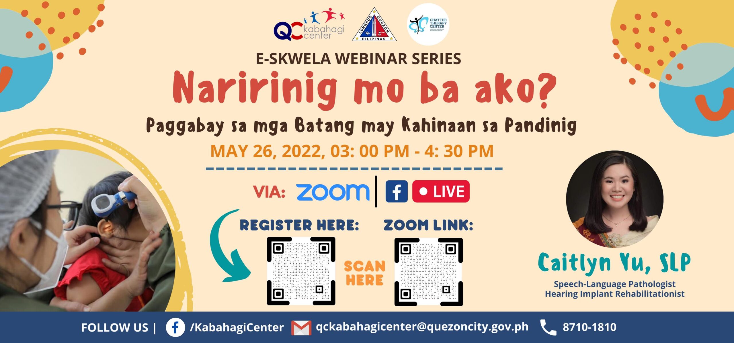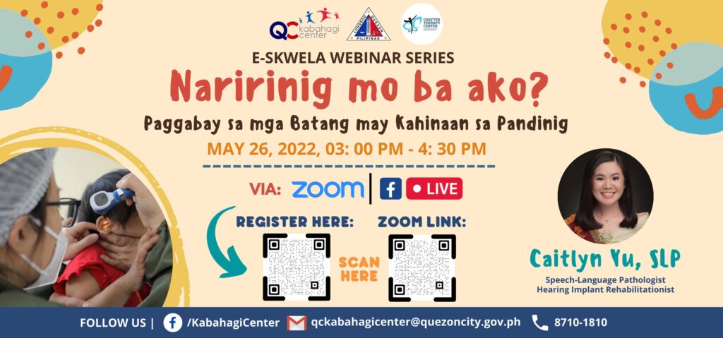 May 26, 2022Magsasagawa ang Quezon City Kabahagi Center for Children with Disabilities ng Webinar na pinamagatang “Naririnig mo ba ako? Paggabay sa mga Batang may Kahinaan sa Pandinig” para bigyang patnubay ang mga bataang mahina ang pandinig.
