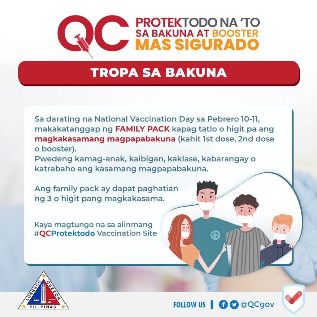February 10, 2022Sa darating na National Vaccination Day sa Pebrero 10-11, makakatanggap ng FAMILY PACK kapag tatlo o higit pa ang magkakasamang magpapabakuna (kahit 1st dose, 2nd dose o booster).