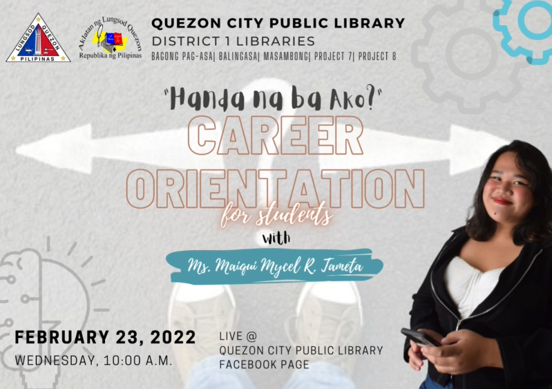 February 23, 2022#KabataangQC, handa ka na ba?Ang Quezon City Public Library ay magsasagawa ng Career Orientation para sa mga mag-aaral upang makapag-bigay ng gabay sa pagpili ng karera na angkop sa kanilang kaalaman, kasanayan, at kakayahan.