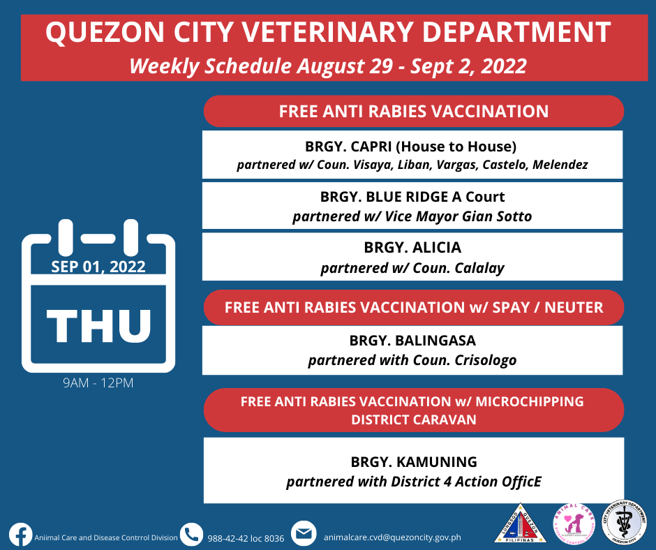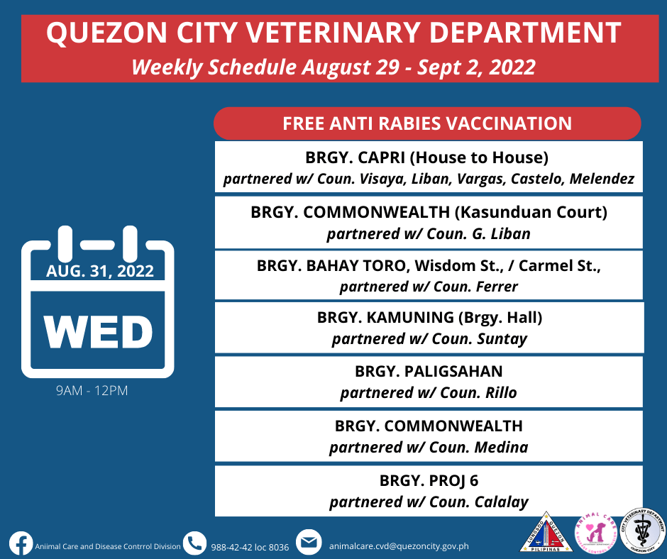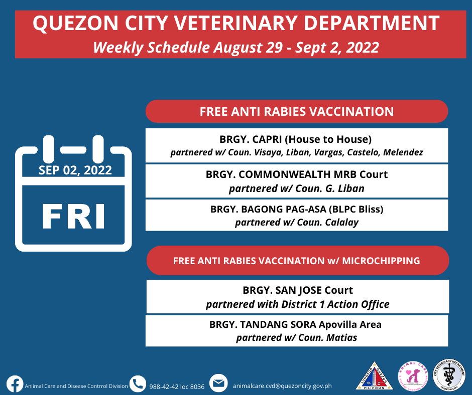Maaari ring mag-book ng schedule sa https://fb.com/book/QCAnimalCare/ para sa libreng anti-rabies vaccination sa Quezon City Hall.