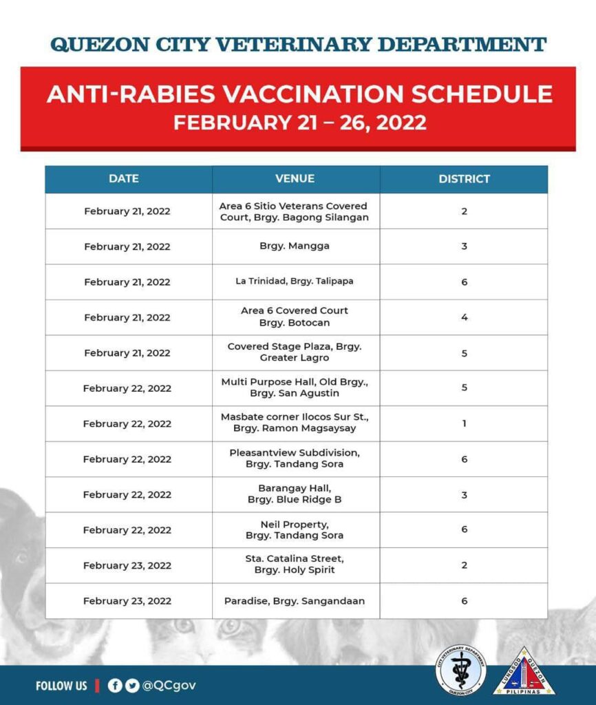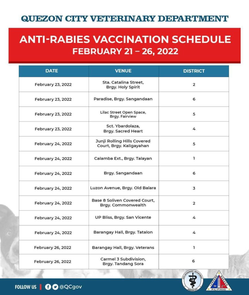 February 21, 2022Heads up, QCitizens!Narito ang schedule ng libreng anti-rabies vaccine para sa inyong alagang hayop ngayong linggo ![]()