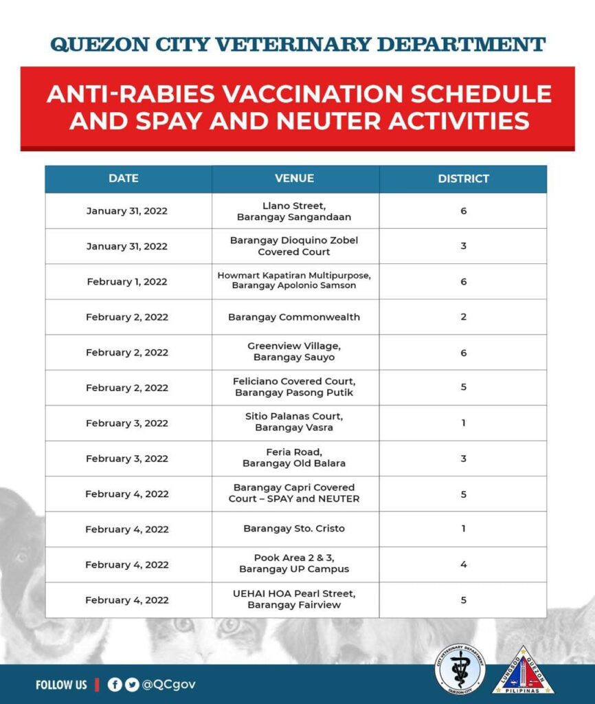 January 31, 2022TINGNAN: Narito ang schedule ng libreng anti-rabies vaccination at kapon para sa inyong fur babies ngayong linggo. 🐶🐱