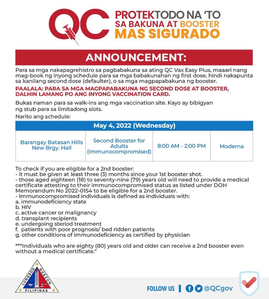VACCINATION SCHED: May 04, 2022 – Second Booster for Adults (Immunocompromised)