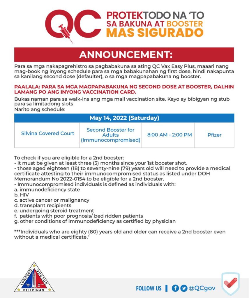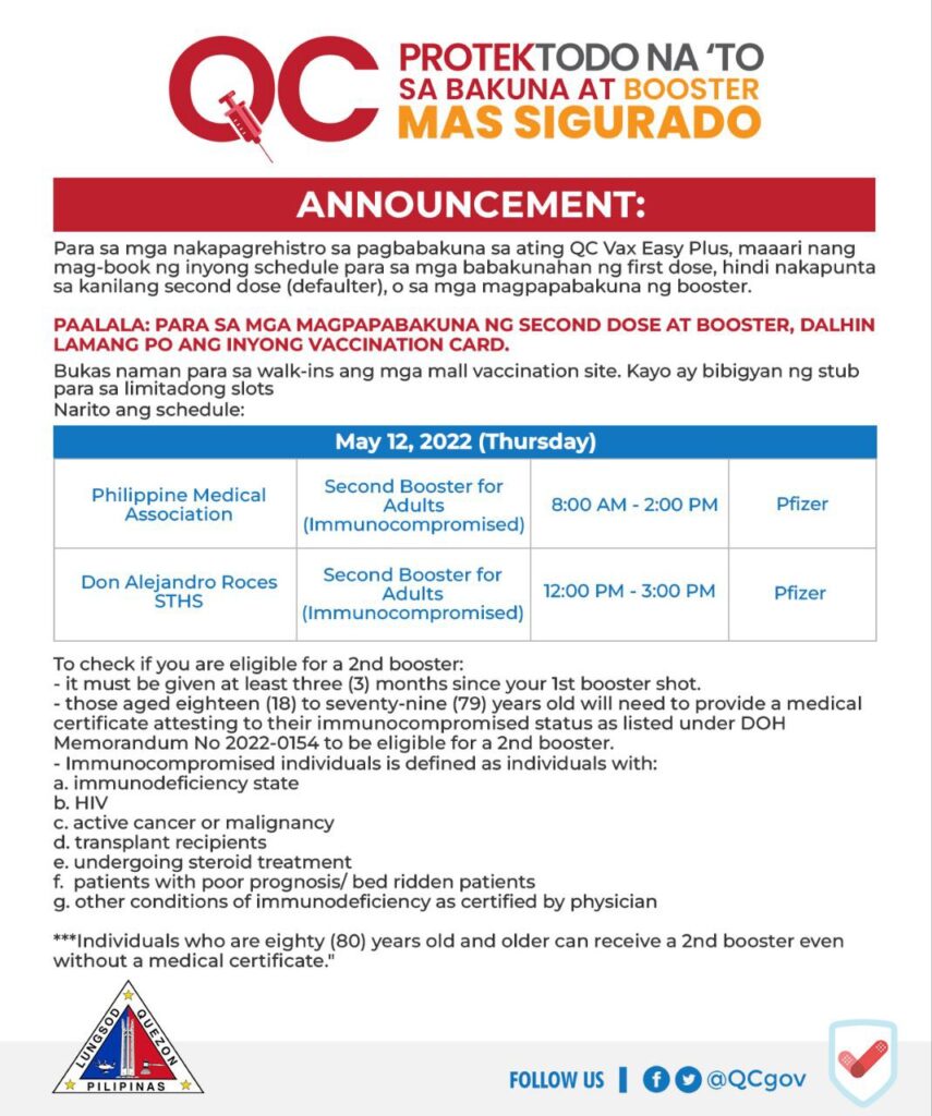 May 12, 2022Maaari nang mag-book ng second dose booster shots ang mga KWALIPIKADONG SENIOR CITIZEN (80 years old pataas) at immunocompromised persons base sa listahan ng DOH Memorandum No 2022-0154.
