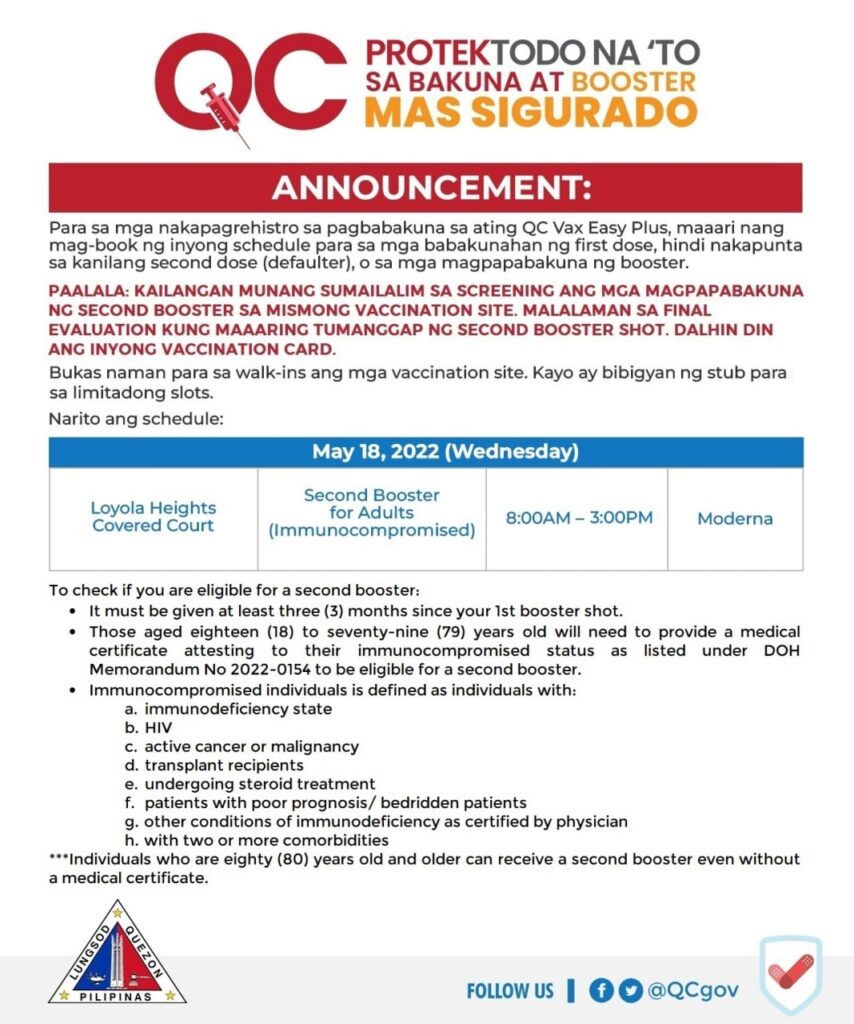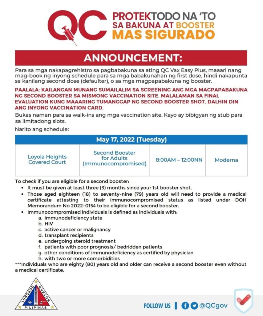 VACCINATION SCHED: May 17-18, 2022 – Second Booster for Adults (Immunocompromised) / Senior Citizens