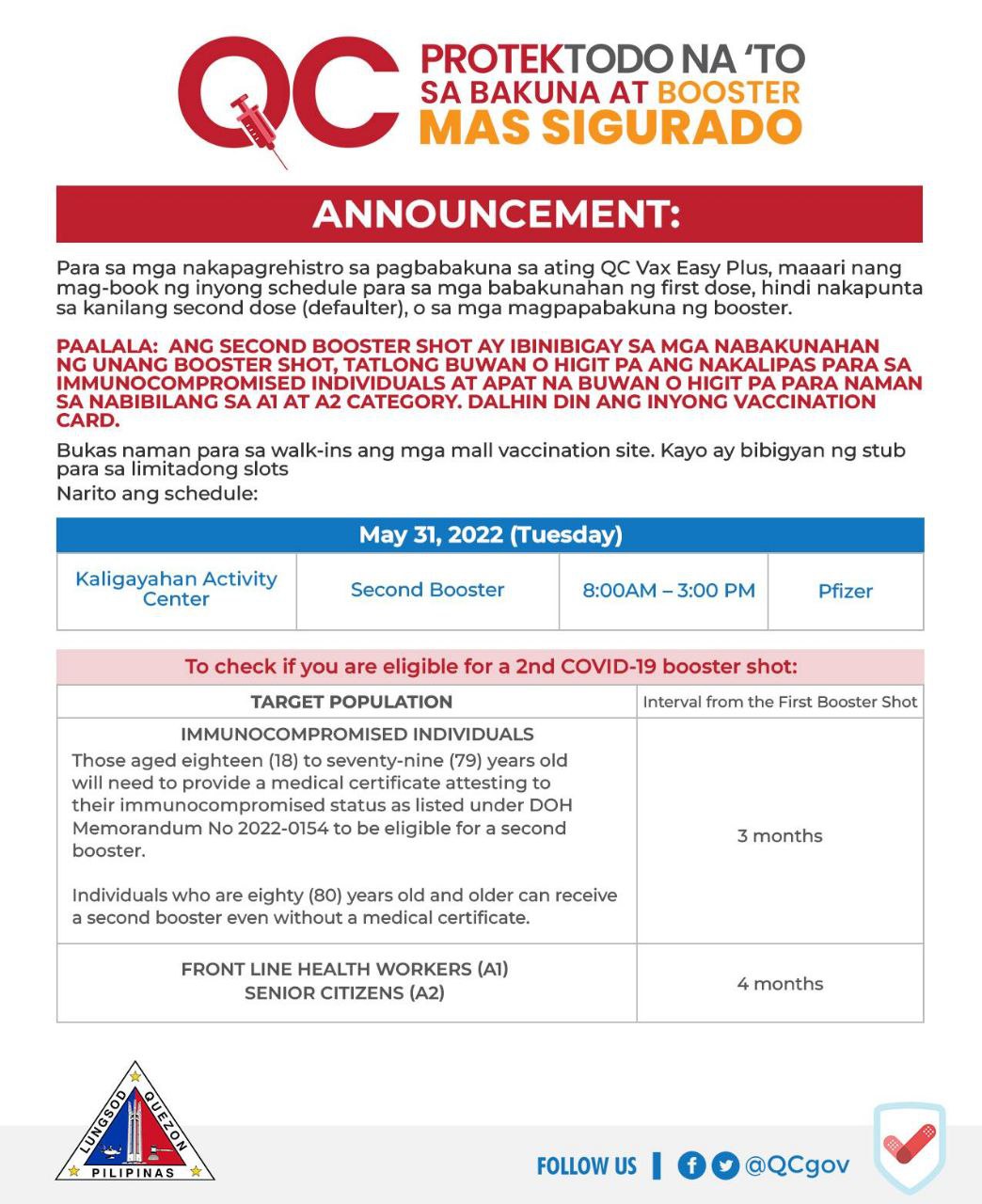 May 30, 2022Maaari nang mag-book ng second booster shot ang SENIOR CITIZENS, FRONTLINE HEALTH WORKERS, at IMMUNOCOMPROMISED ADULTS.