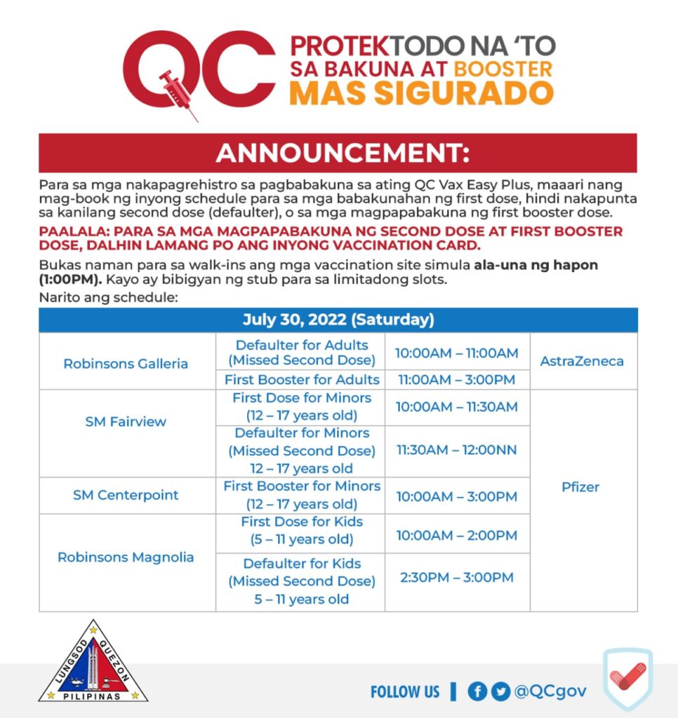 Vaccination Schedule – August 9-14, 2022