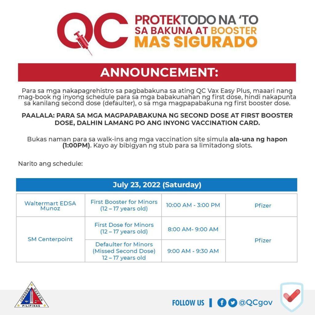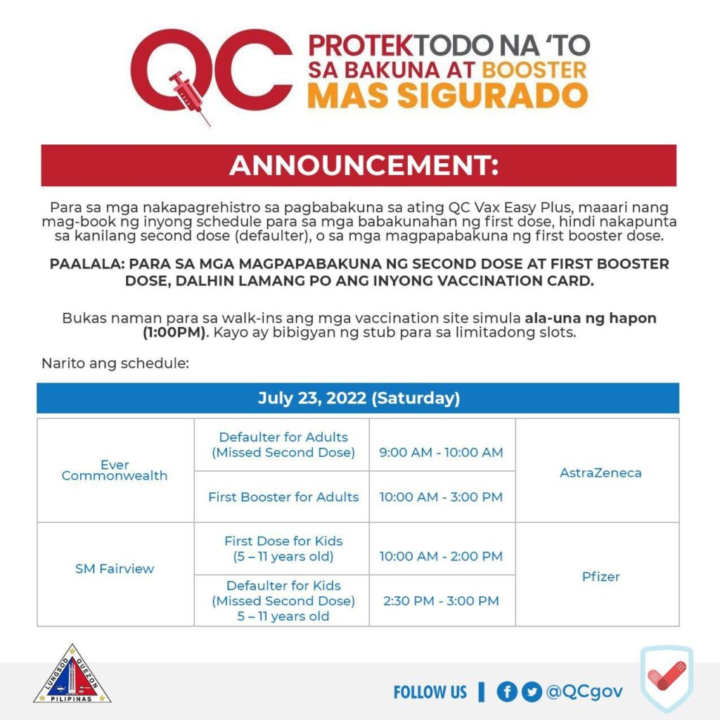 July 19, 2022Maaari nang mag-book ng first dose, missed second dose (defaulter), at first booster shot ang mga kabilang sa pediatric (12-17 years old) population, habang missed second dose (defaulter), at first booster shot para sa adult population at first dose at missed second dose (defaulter) naman para sa mga batang edad 5-11 years old.