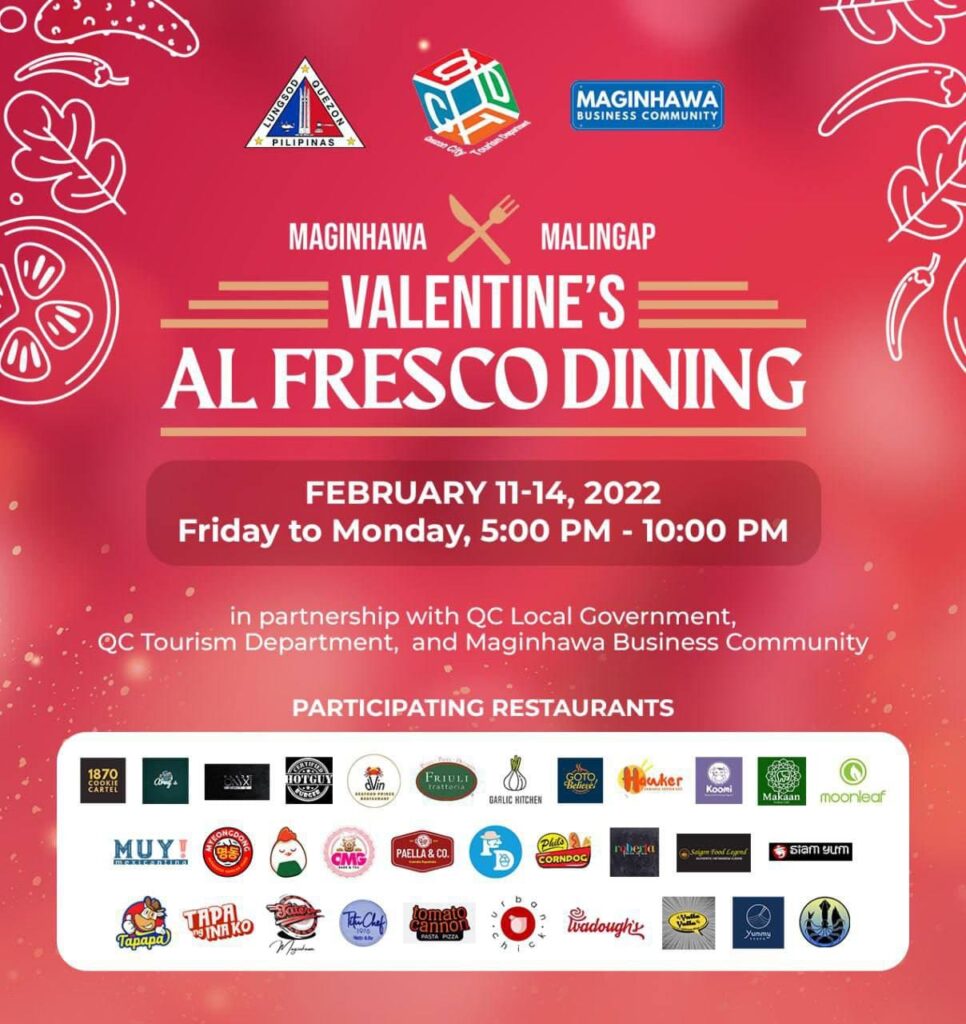Maginhawa and Malingap got you as their Al Fresco Dining is back this coming February 11-14, 2022, 5:00PM-10:00PM.