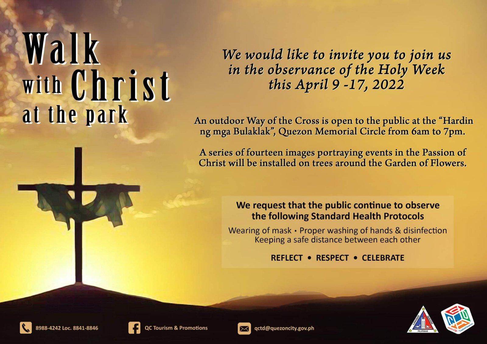 April 9, 2022Ang Pamahalaang Lungsod Quezon sa Pamamagitan ng Tanggapan ng Turismo at ng Quezon Memorial Circle ay magbubukas ng Daan ng Krus (Way of the Cross) sa Hardin ng mga Bulaklak sa Quezon Memorial Circle simula sa Abril 9 hanggang Abril 17.