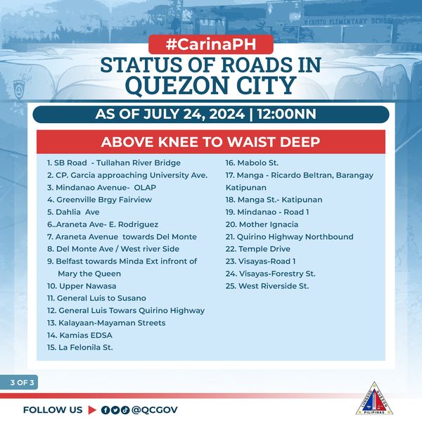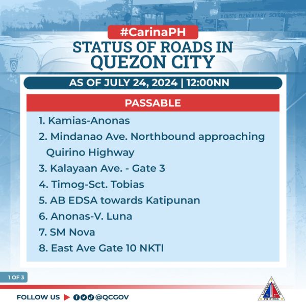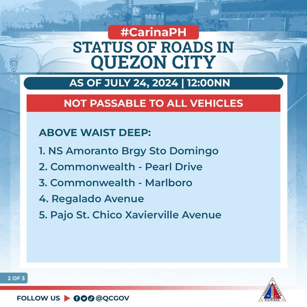 Narito ang update sa mga kalsada sa ating lungsod na maaaring daanan at hindi passable sa lahat ng uri ng sasakyan dahil sa matinding pagbaha dulot ng Bagyong #CarinaPH at Habagat.