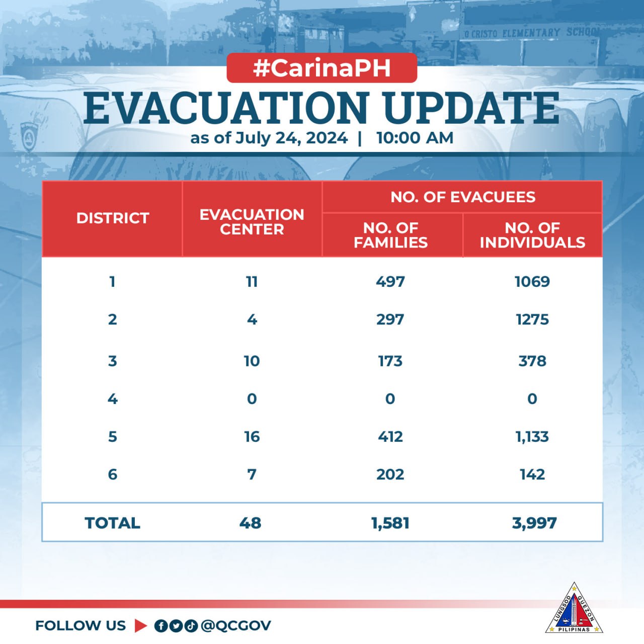 Bilang pag-iingat sa bagyong #CarinaPH, mayroong itinalagang evacuation sites sa mga piling lugar na bahain o may banta ng landslide para sa ligtas at mabilis na evacuation ng humigit-kumulang 1,581 na pamilya at 3,997 indibidwal sa ating lungsod.