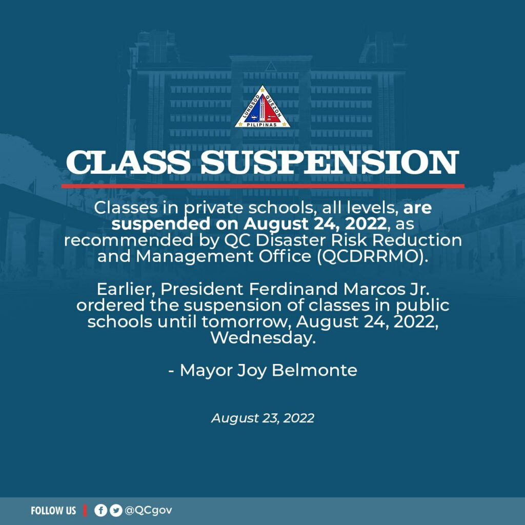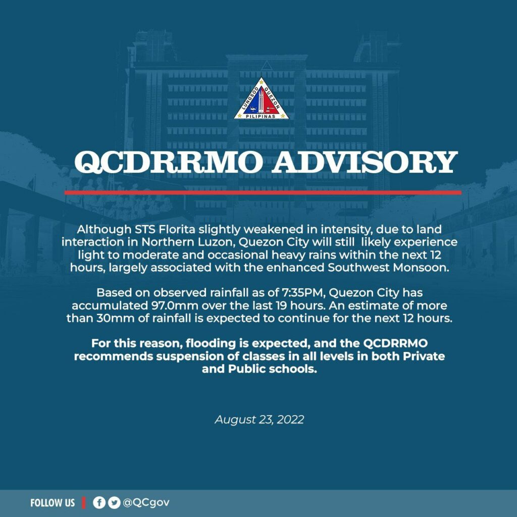 For this reason, flooding is expected, and the QCDRRMO recommends suspension of classes in all levels in both Private and Public schools tomorrow, August 24, 2022.