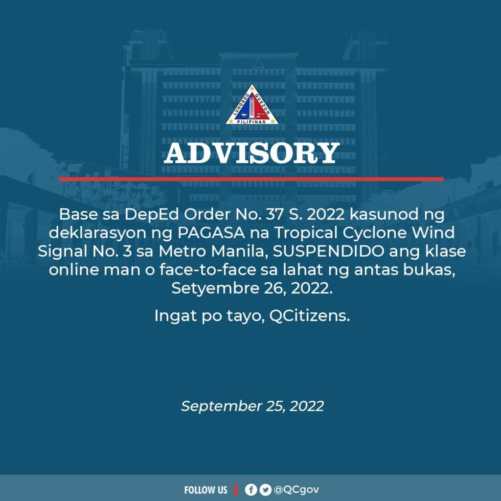 Base sa DepEd Order No. 37 S. 2022 kasunod ng deklarasyon ng PAGASA na Tropical Cyclone Wind Signal No. 3 sa Metro Manila, SUSPENDIDO ang klase online man o face-to-face sa lahat ng antas bukas, Setyembre 26, 2022.