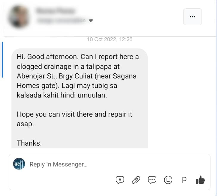 Nabigyang solusyon ang reklamo ng isang QCitizen na nagpadala ng mensahe sa Quezon City Government Facebook page ukol sa baradong drainage sa Abenojar St., Brgy. Culiat na nagdudulot ng pagbaha sa kalsada.