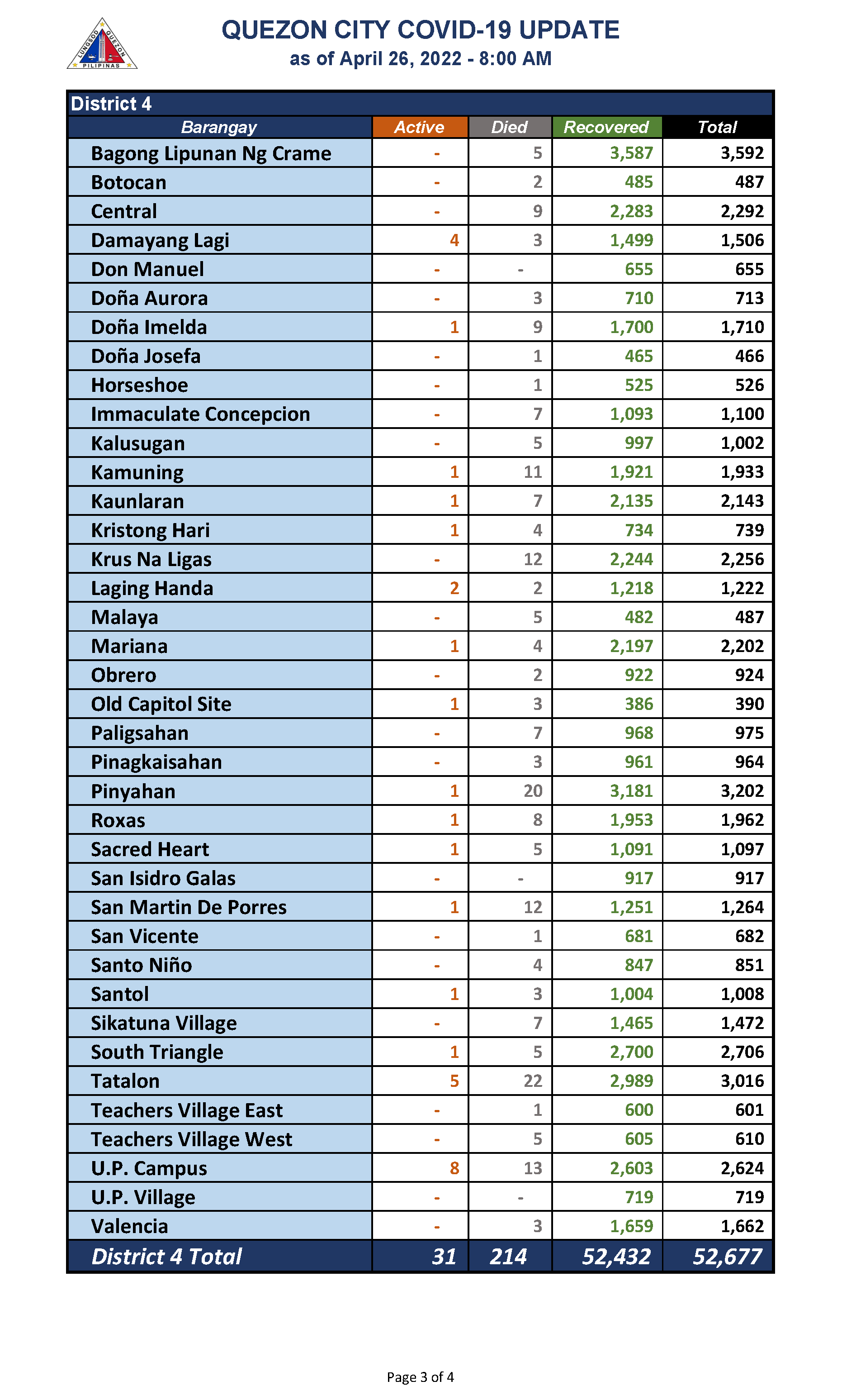 QC COVID-19 UPDATE – AS OF April 26, 2022 – 8AM