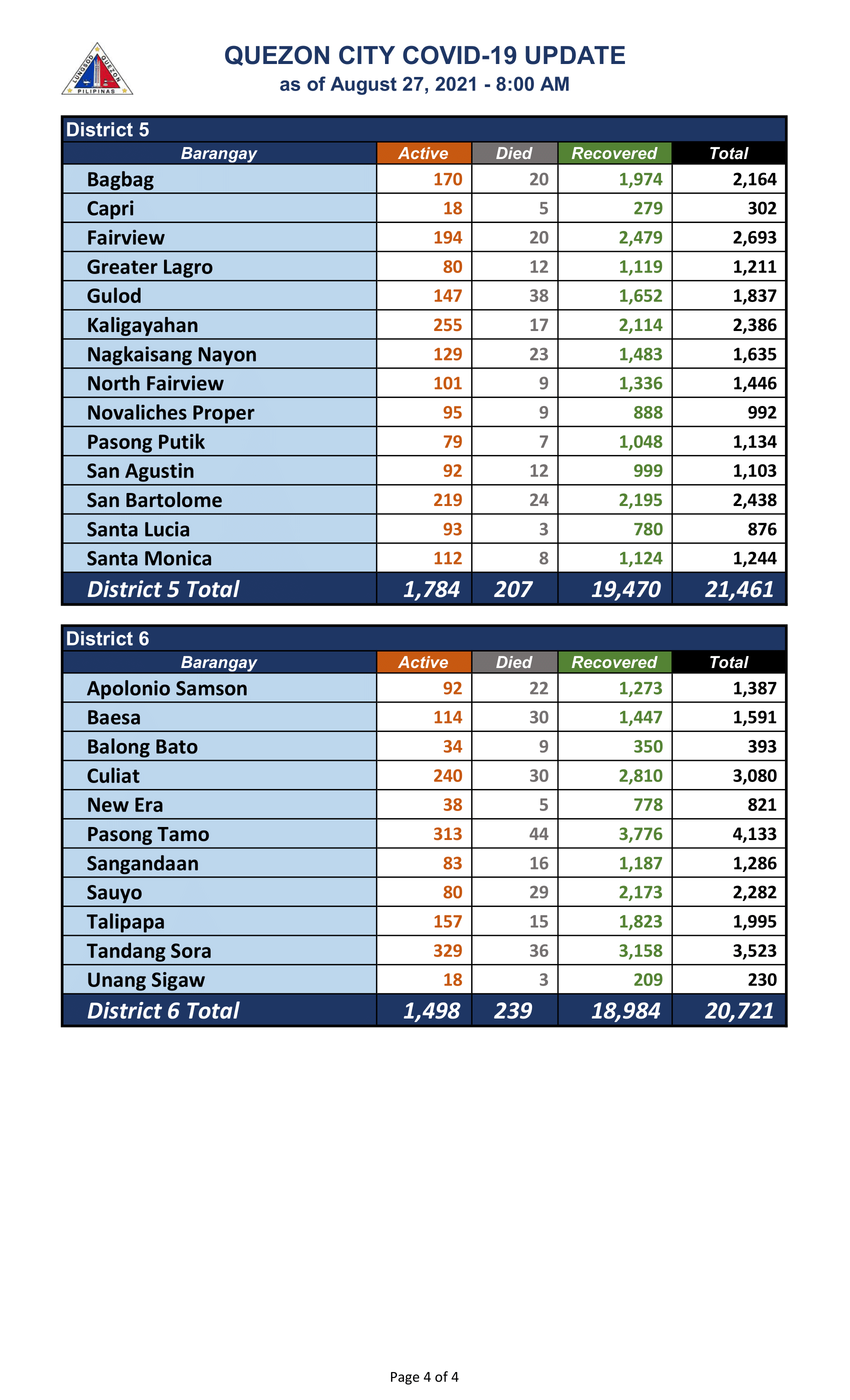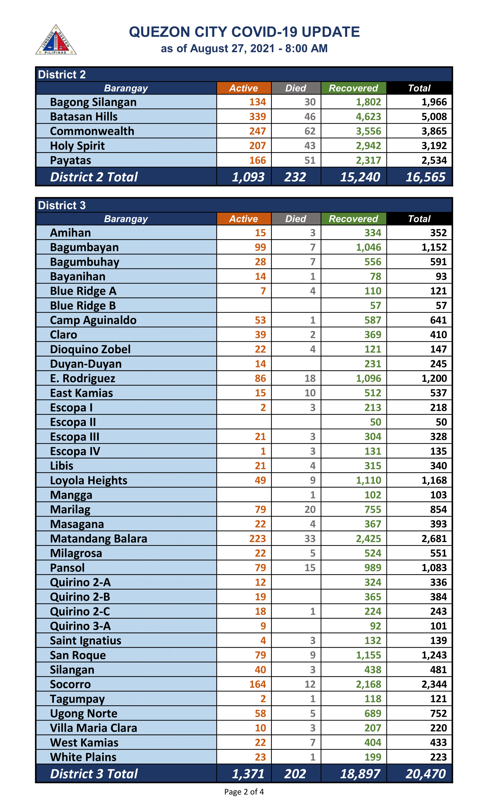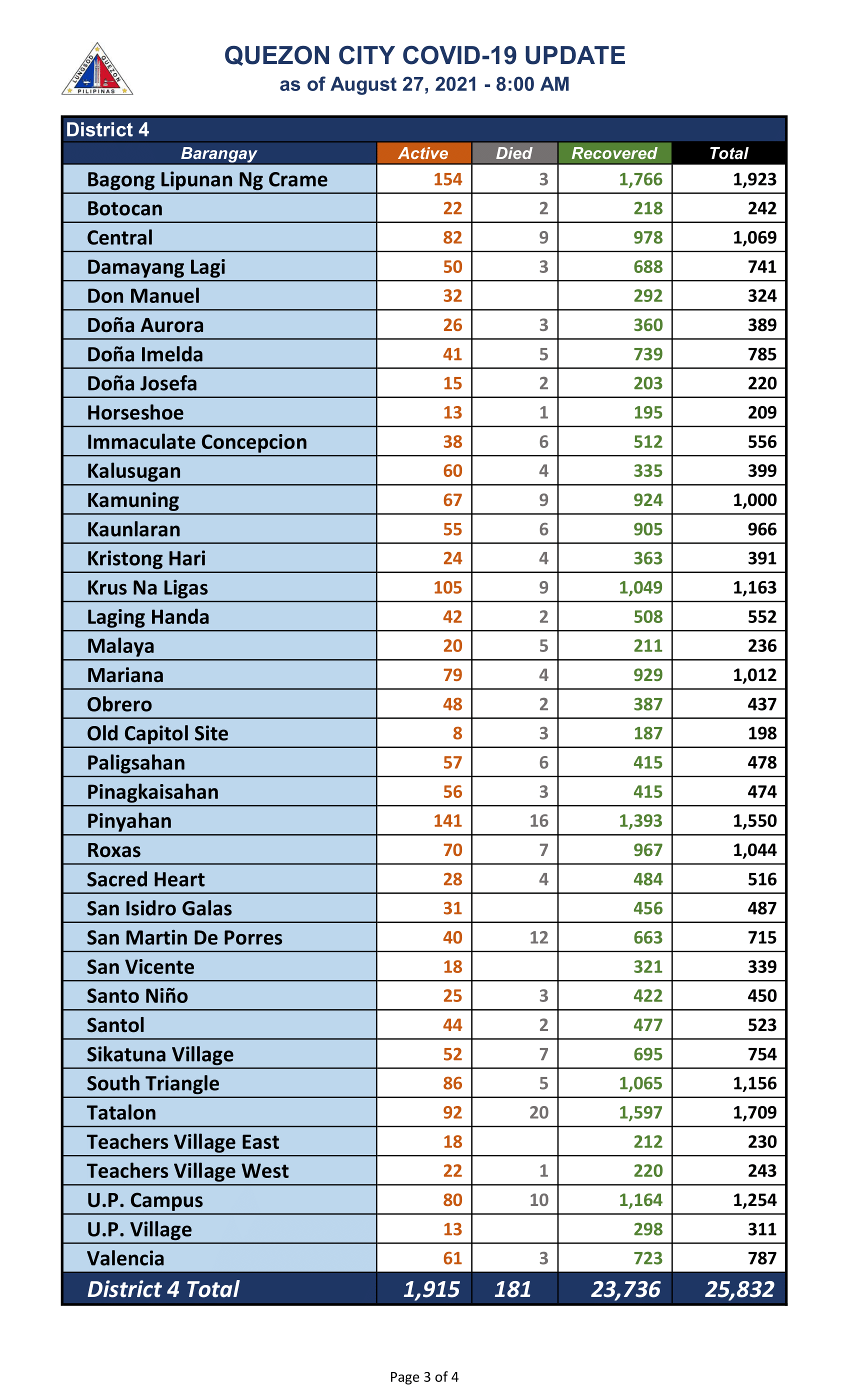 QC COVID-19 UPDATE – AS OF August 27, 2021 – 8AM
