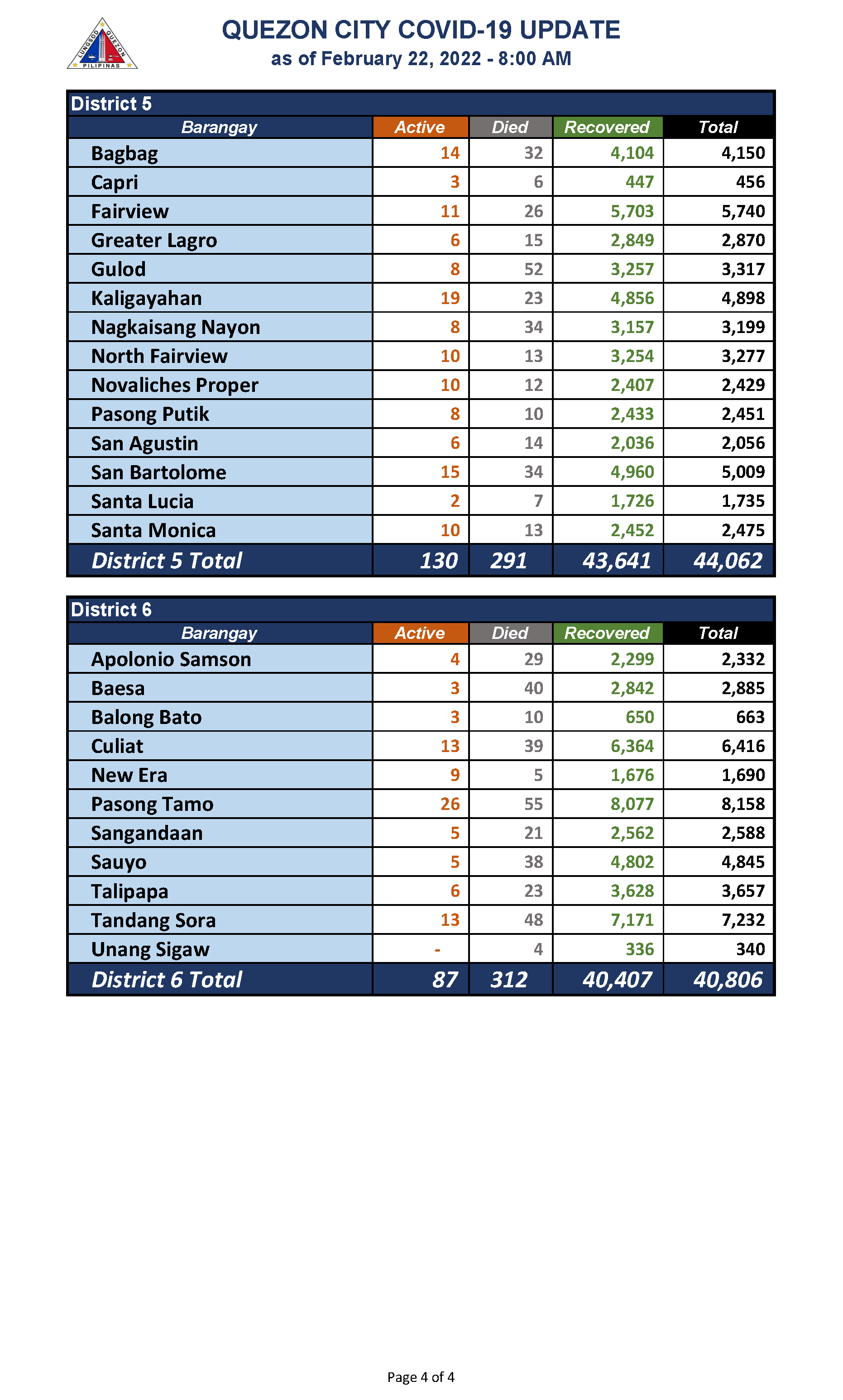 QC COVID-19 UPDATE – AS OF February 22, 2022 – 8AM