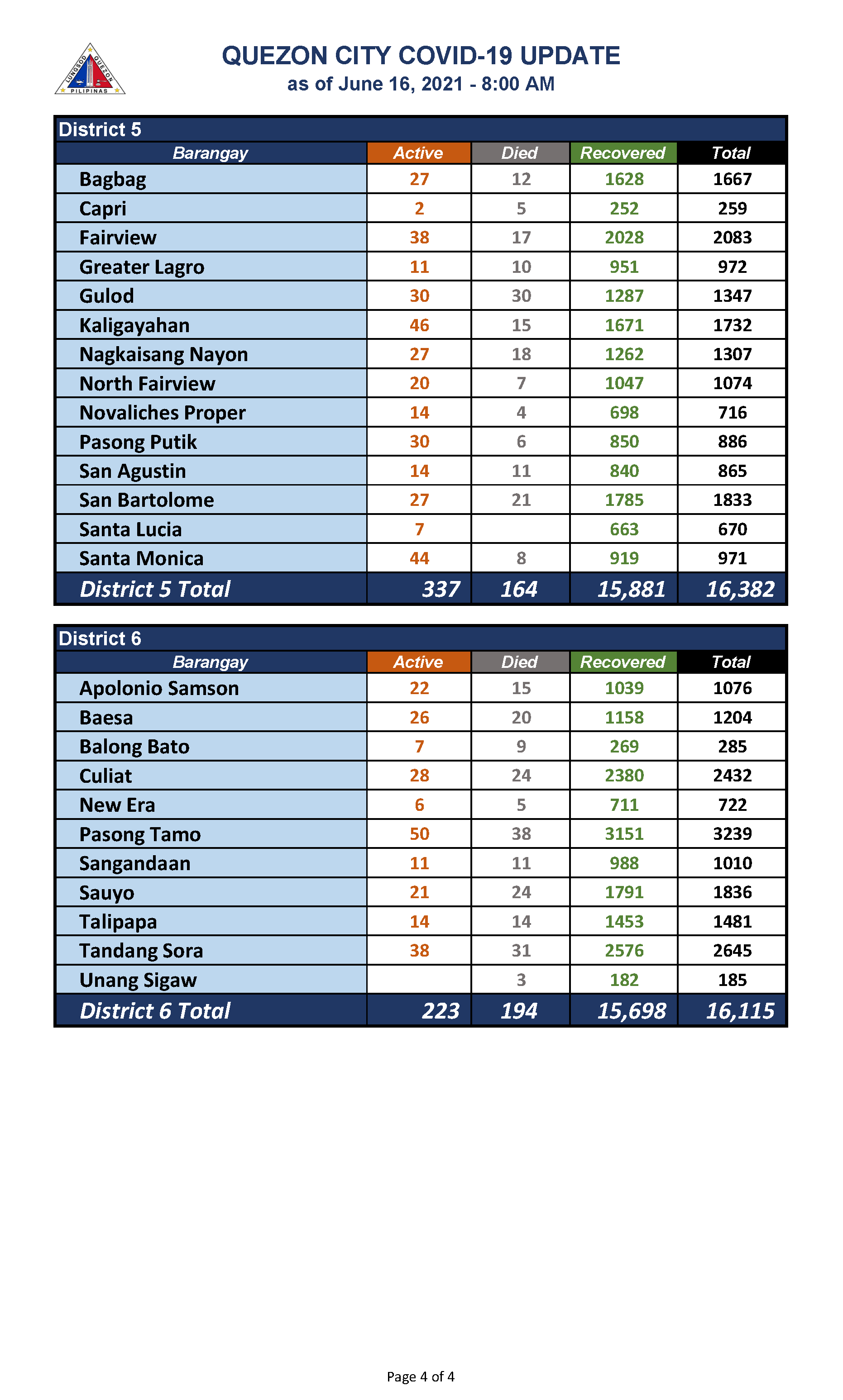 QC COVID-19 UPDATE – AS OF June 16, 2021 – 8AM