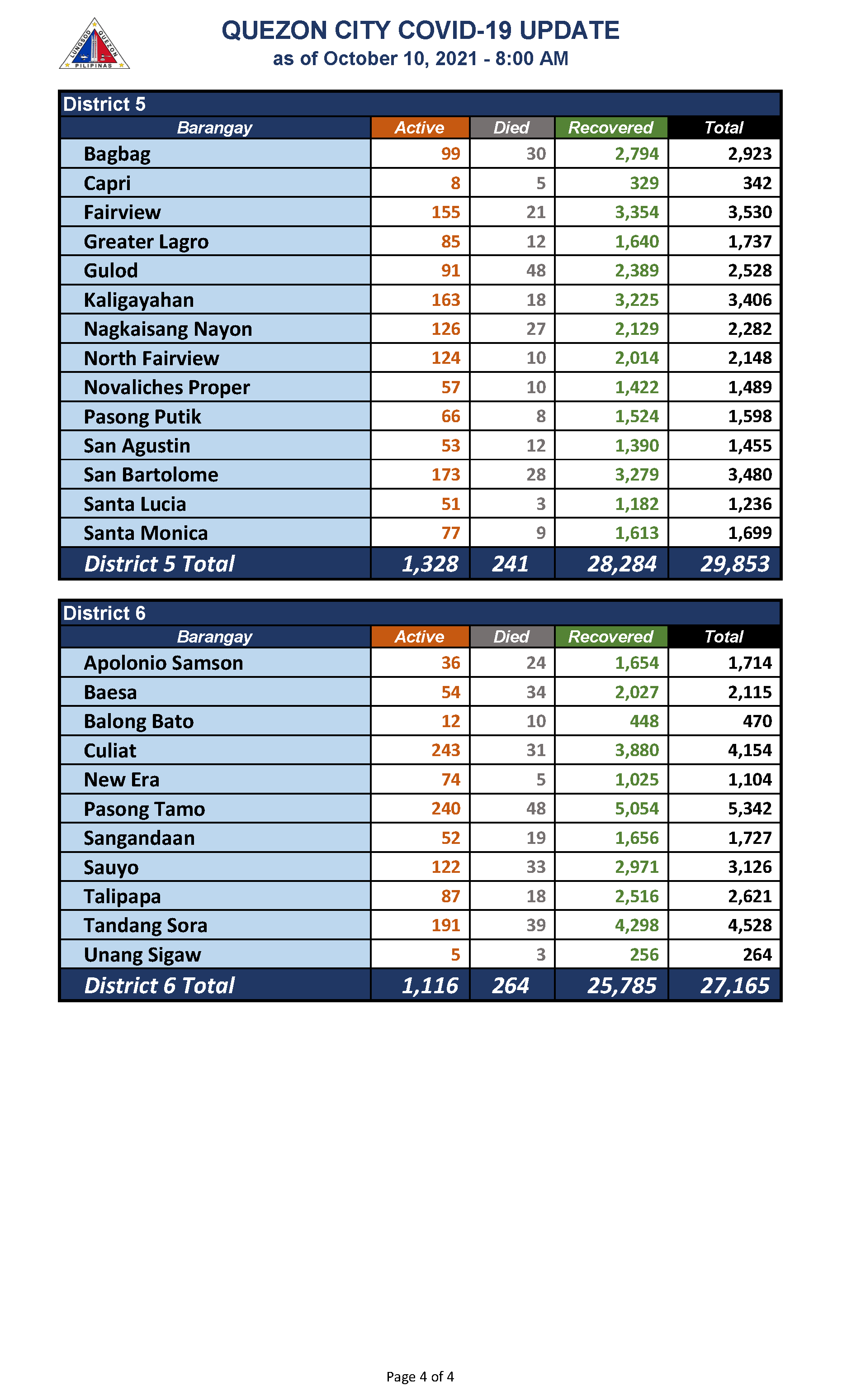QC COVID-19 UPDATE – AS OF October 10, 2021 – 8AM