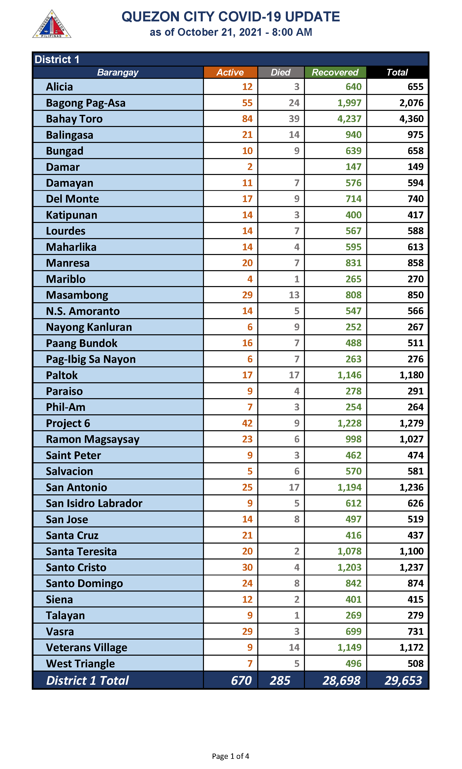 QC COVID-19 UPDATE – AS OF October 21, 2021 – 8AM