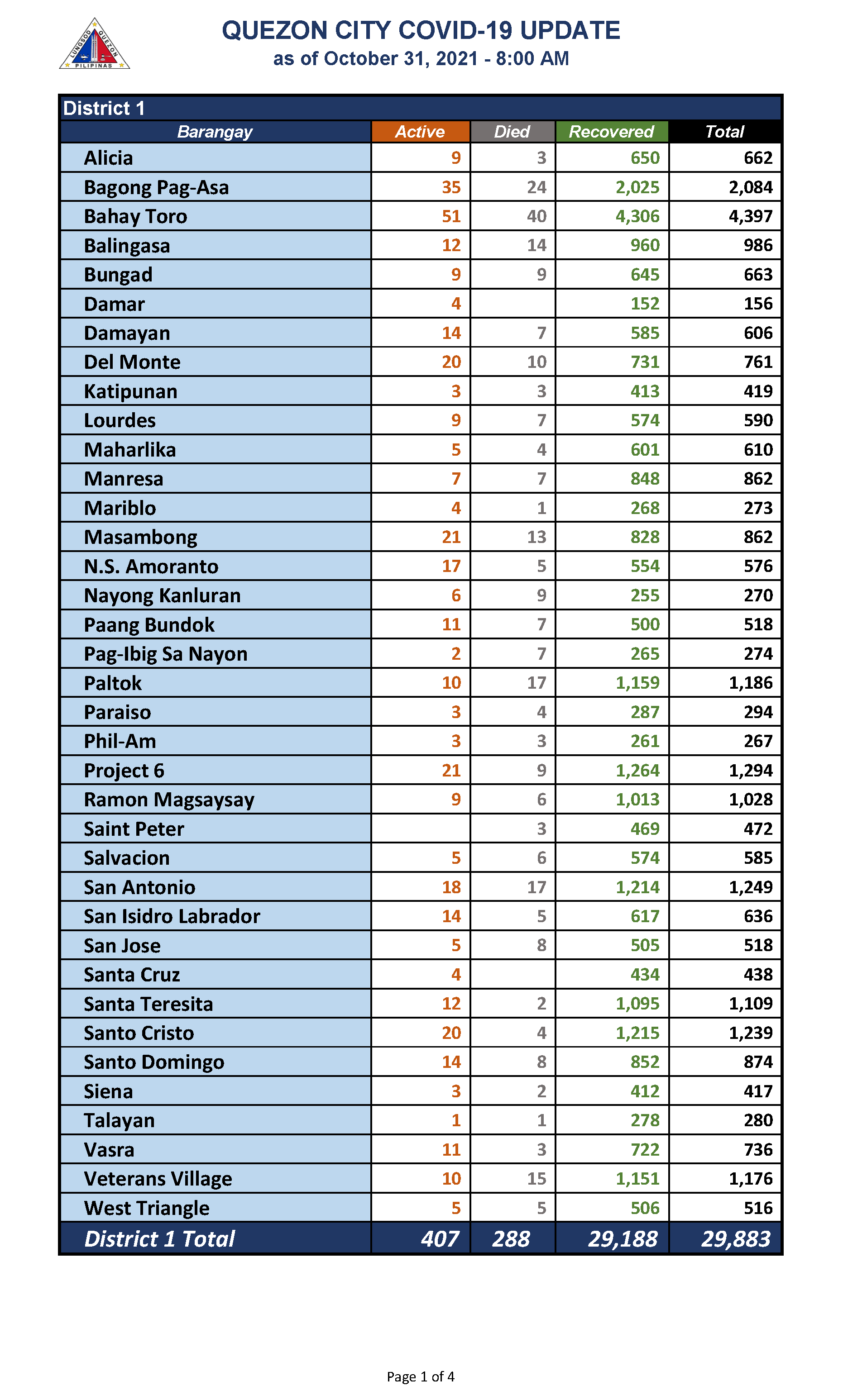 QC COVID-19 UPDATE – AS OF October 31, 2021 – 8AM