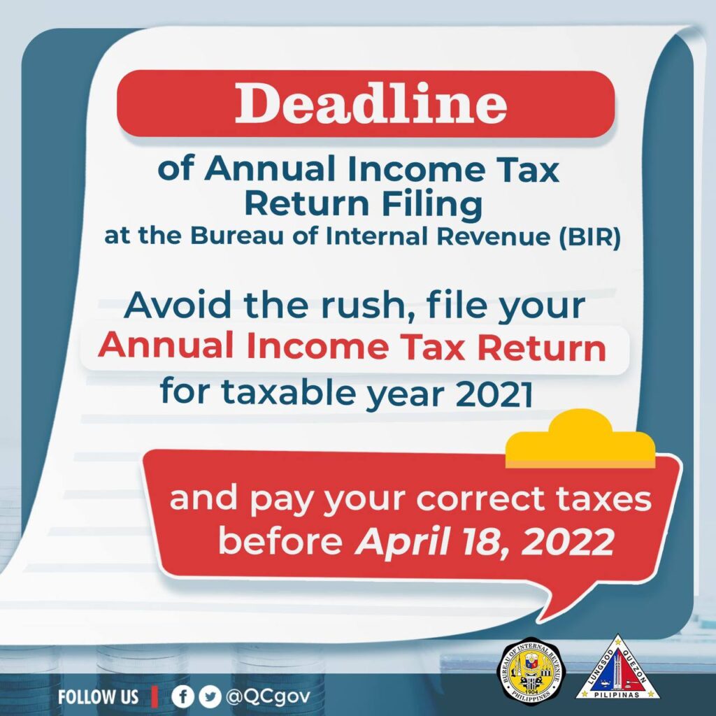 Deadline of Annual Income Tax Return Filing at the Bureau of Internal Revenue (BIR) is on April 18, 2022.