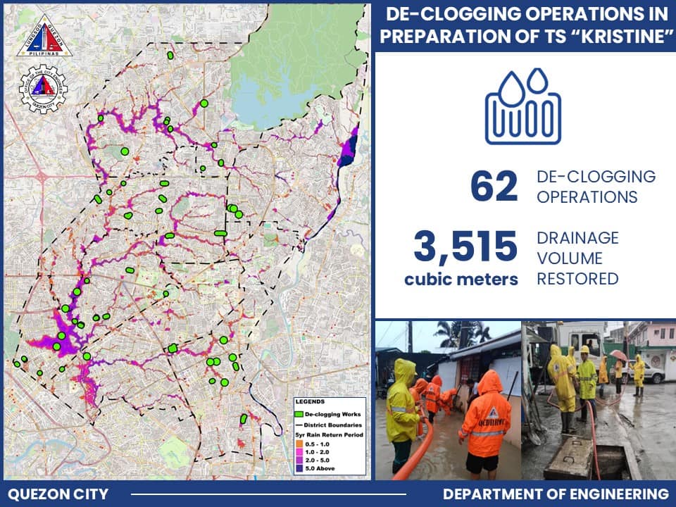 Bilang pagtugon sa patuloy na pag-ulan dulot ng Severe Tropical Storm “Kristine,” ang Quezon City Government, sa pangunguna ng Department of Engineering, ay patuloy na nagsasagawa ng de-clogging operations upang mabawasan at maiwasan ang pagbaha sa komunidad. Mahigit sa 17 de-clogging activities ang naisagawa na ngayong araw, kaya’t umabot na sa kabuuang bilang na 62 ang mga naisagawang de-clogging activities.