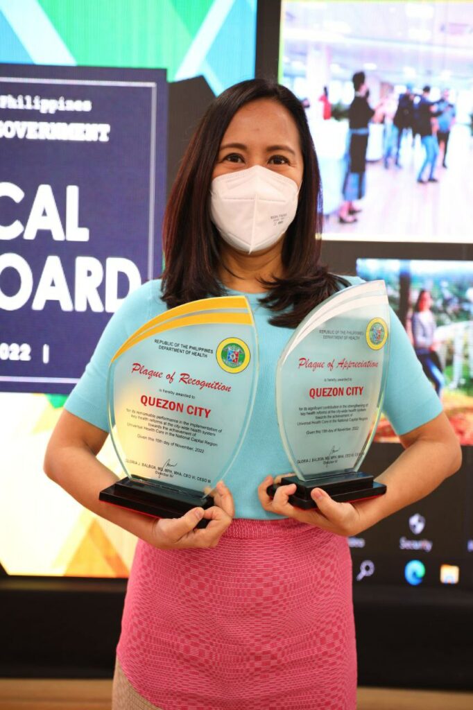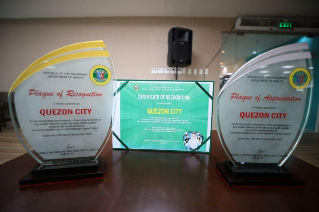 Nakatanggap din ang QC ng plaque of recognition at appreciation mula sa DOH-MMCHD dahil sa pagpapalakas ng city-wide health system na naging susi naman sa tagumpay ng Universal Health Care implementation sa NCR.