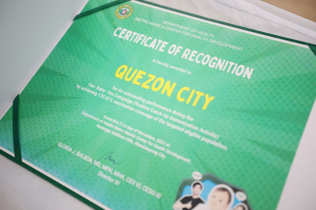 Pinarangalan ng Department of Health – Metro Manila Center for Health Development (DOH-MMCHD) ang Quezon City Government dahil naabot ng QC ang Vax Baby Vax routine catch-up vaccination target nito.