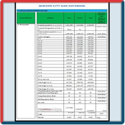 GAD Database – The office maintains a QC GAD Databank as provided in Section 37 of MCW-IRR. These are updated QC Gender Profile and GAD-related information to be used as baseline data on the status of women and men in QC. It is also being used for gender-responsive planning, programming, and policy formulation.