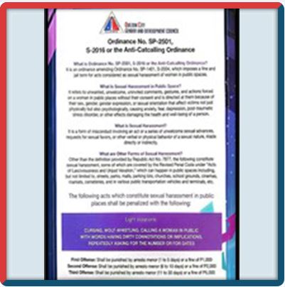 - City Ordinance No. SP-2501, S.2016 entitled “Amended GAD Code To Harmonize With The Provisions of RA No. 9710, Otherwise Known As “The Magna Carta Of Women” And To Adopt The UN Women’s Safe Cities And Safe Public Spaces Initiative”